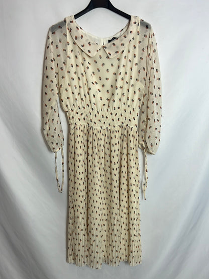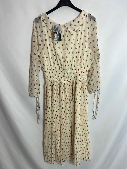 DENNI ROSE. Vestido beige flores plisado. T 42
