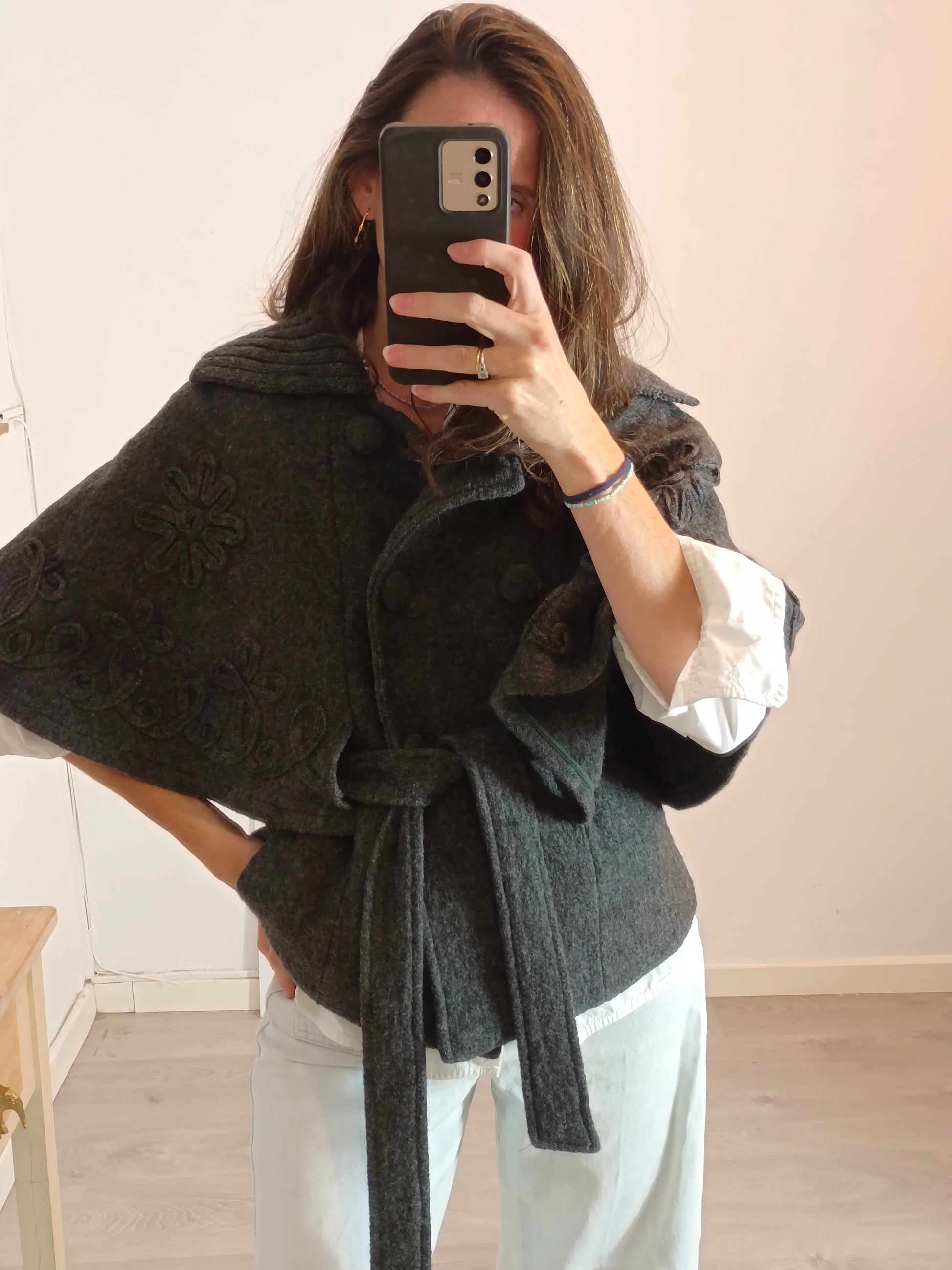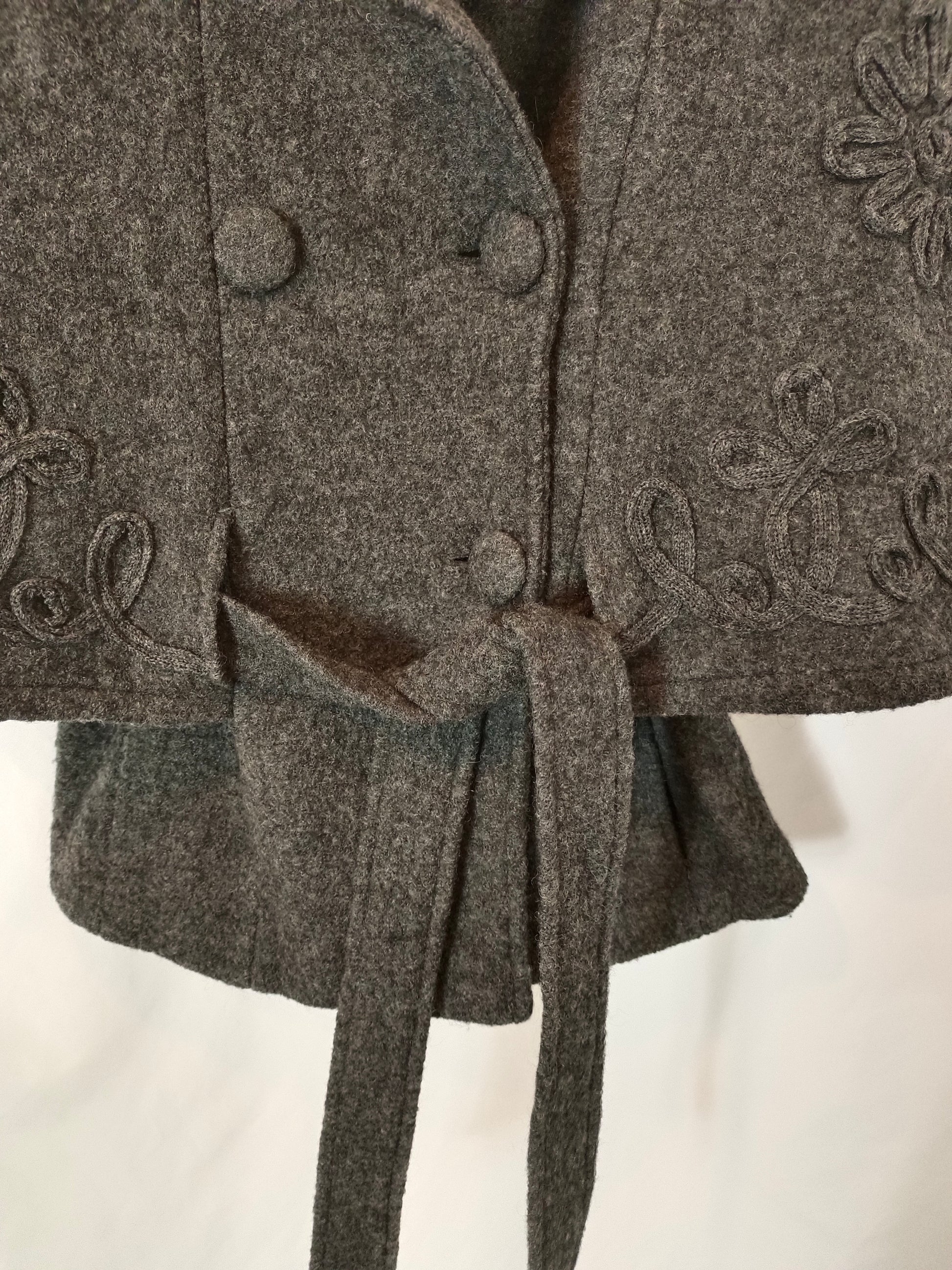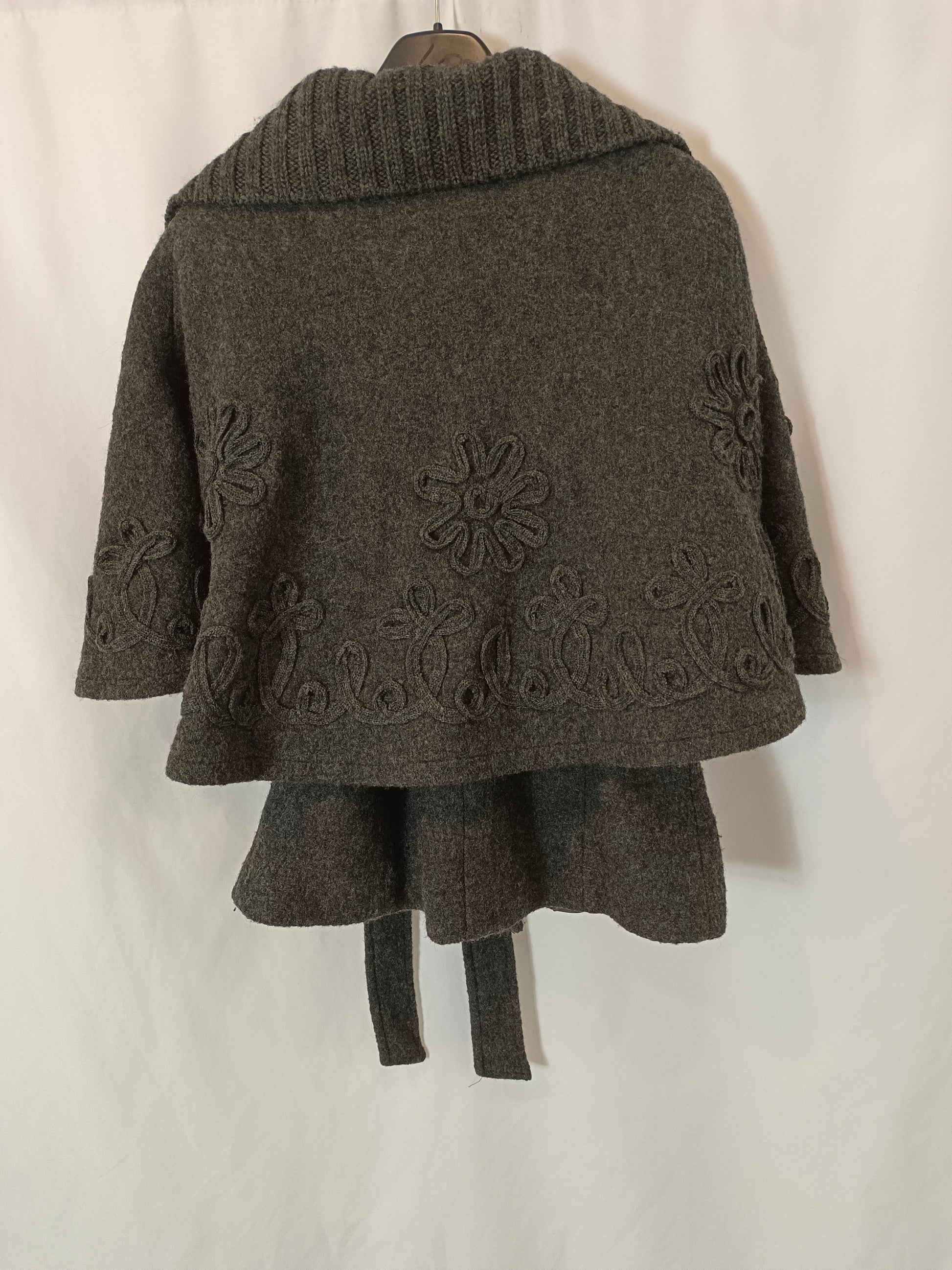 capa de paño gris con detalle de flores bordadas. Cinturón efecto lazada