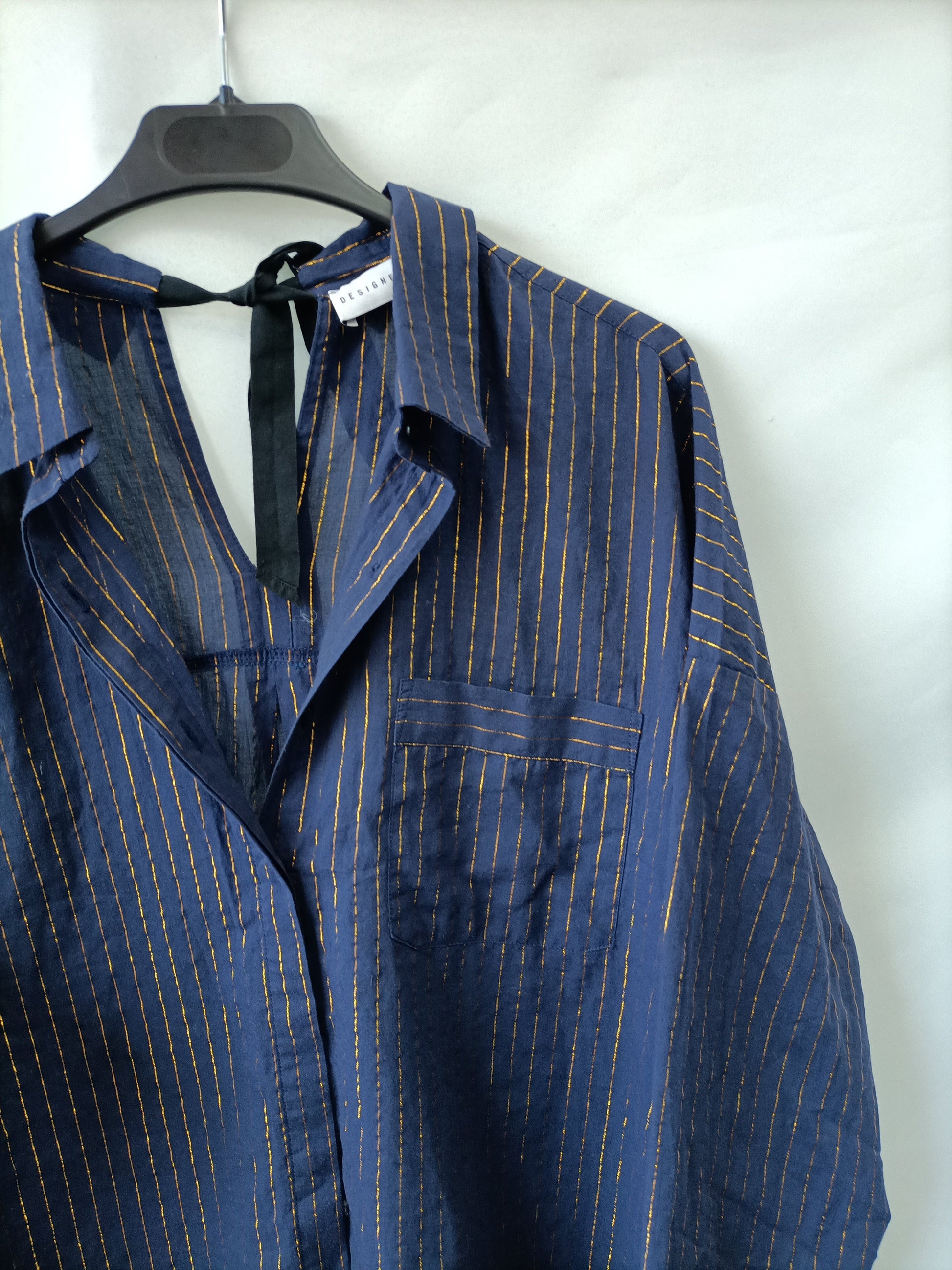 Designer. Blusa azul con rayas doradas. Lazada trasera. Estilo oversized. Largo 74 cm