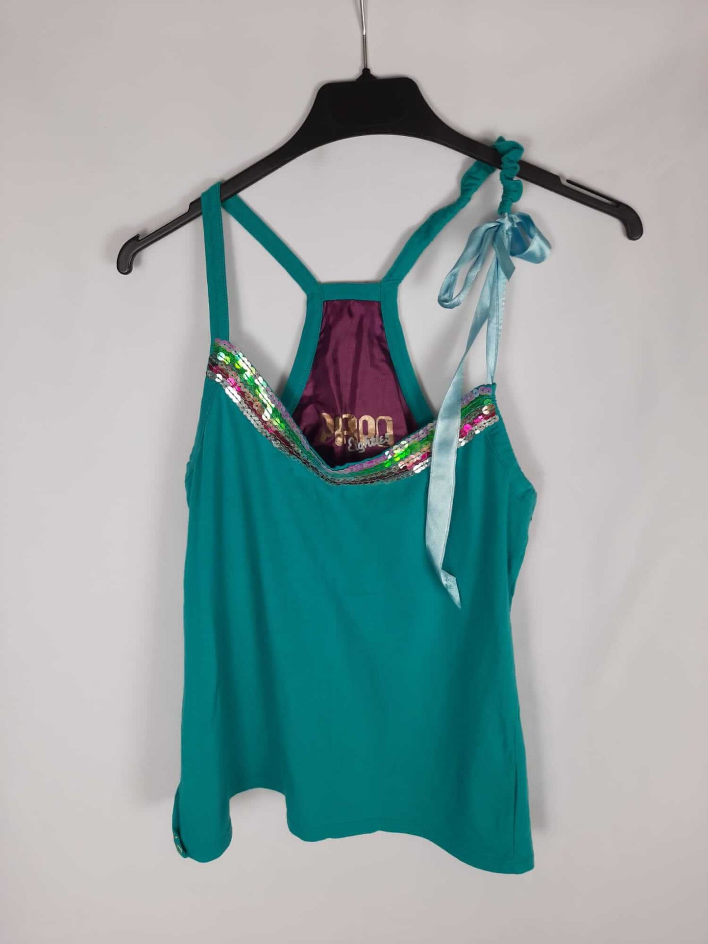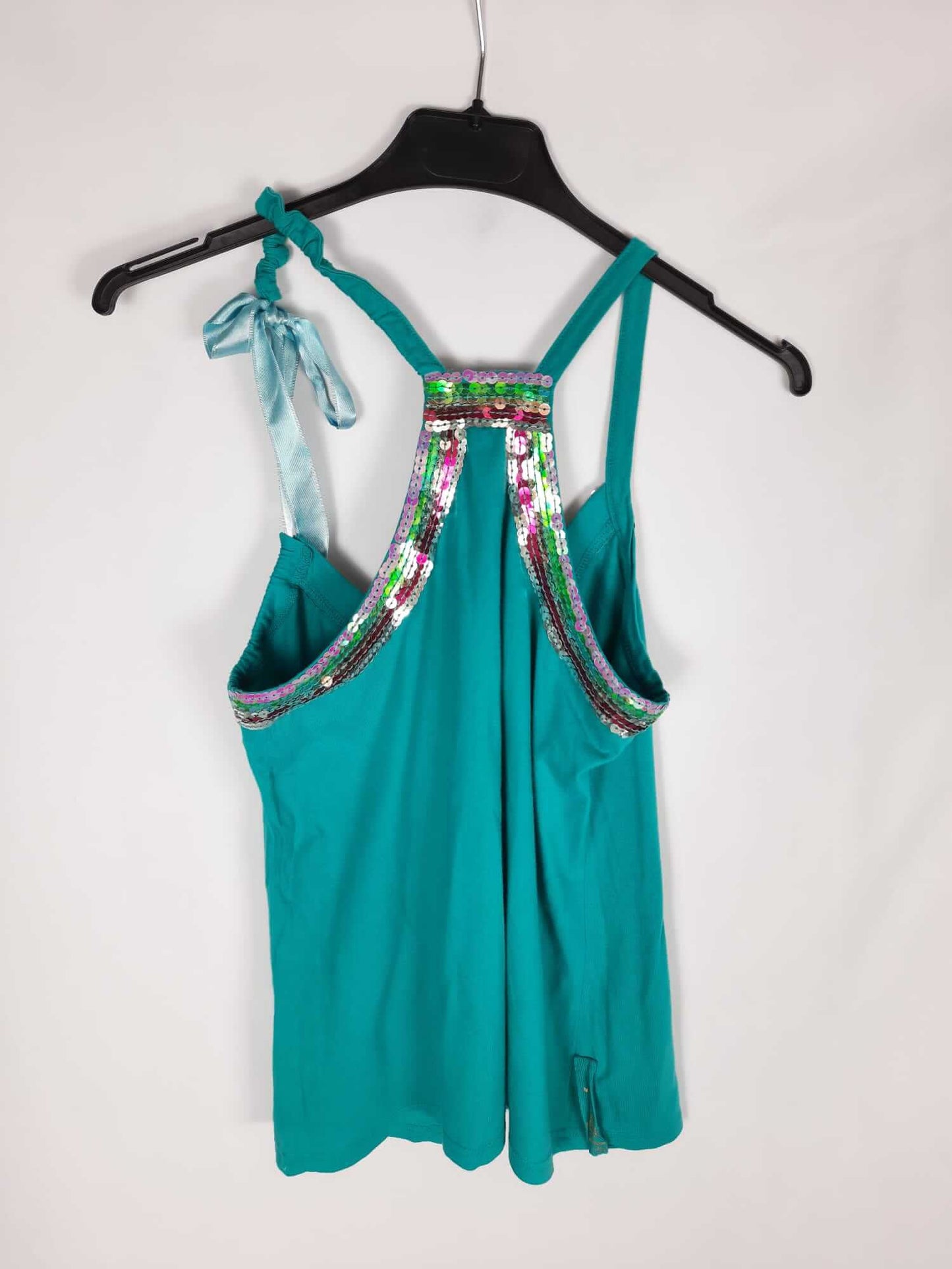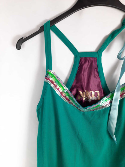 Desiagual. Too de tirantes verde con detalles de lentejuelas. Uno de los tirantes es con lazada ajustable. Elástico. Largo 60 cm