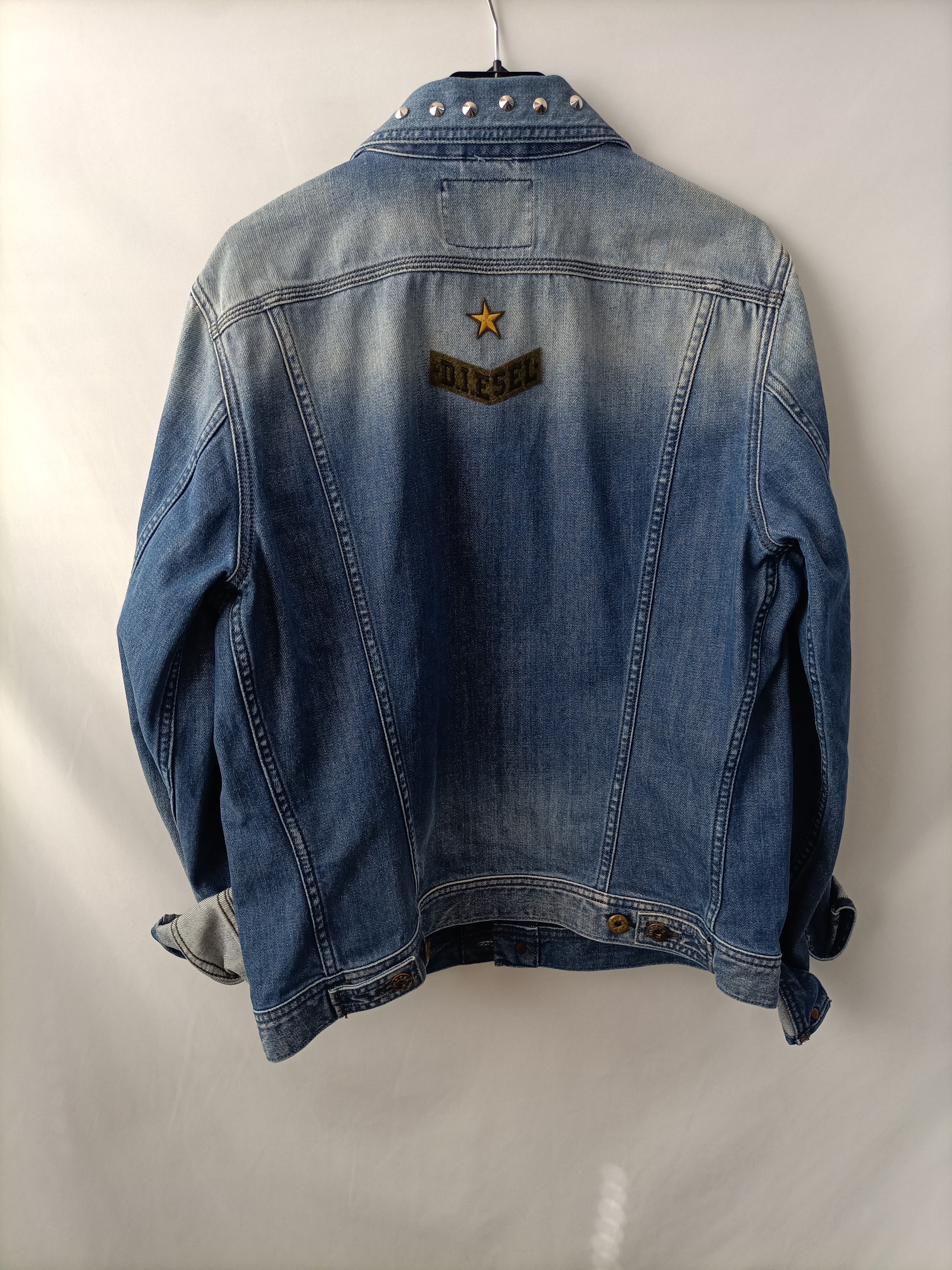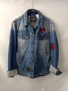 Blusa morada escotada con botones frontales nácar y en las mangas