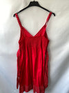 Vestido rojo de tirantes con lunares blancos y dibujo de un mini. Tiene la espalda elástica. Largo 69 cm