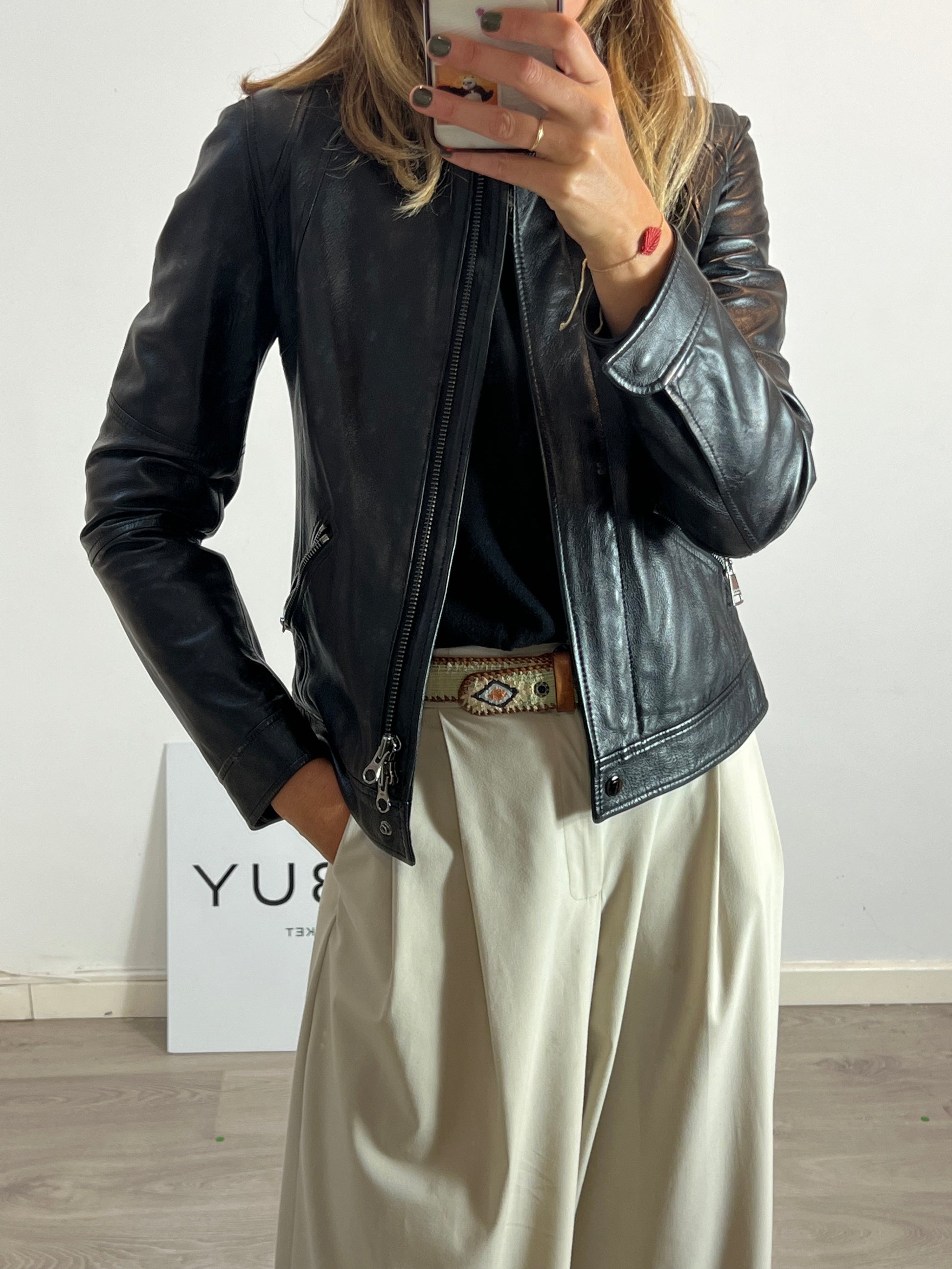 Chaqueta piel negra cremallera. Hombros 42cm, de sisa a sisa 50cm, largo 57cm