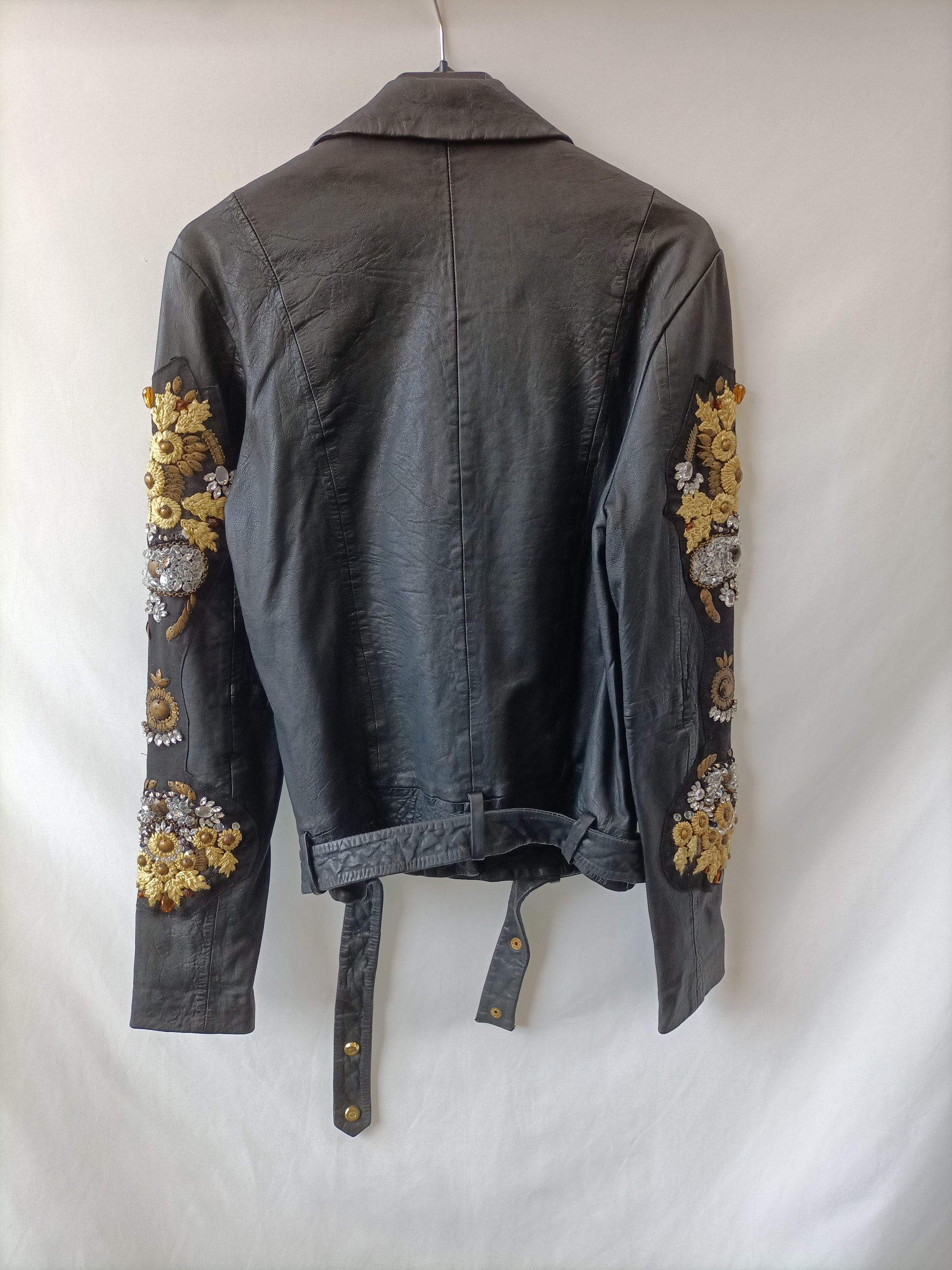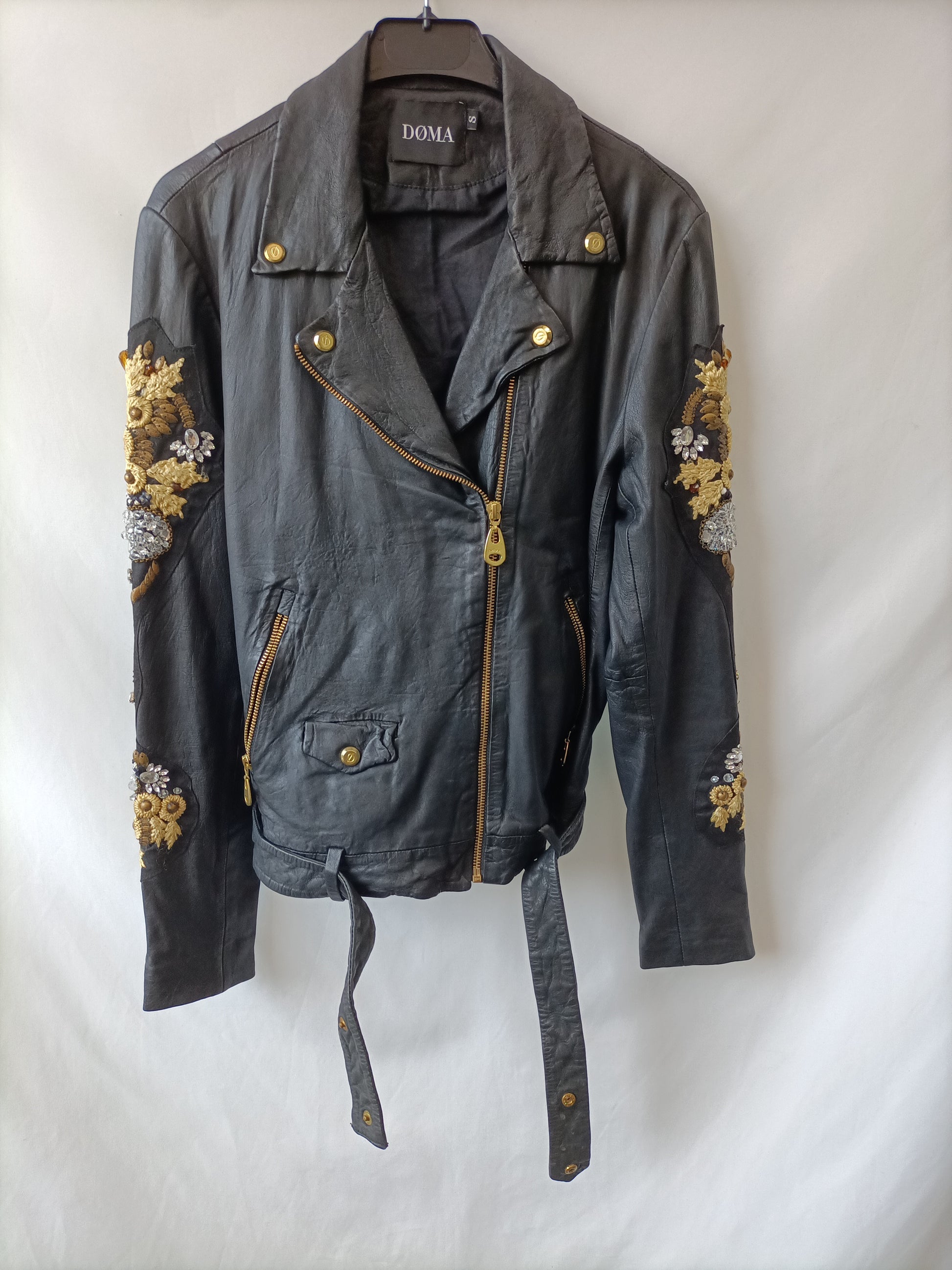 Doma. Cazadora de piel negra con detalle bordados en las mangas. No elástica. De sisa a sisa 45 cm largo 57 cm