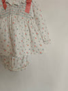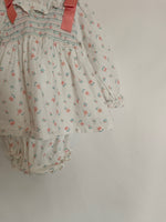 Conjunto blanco con florecitas rosa de vestido con lazada y culetin.