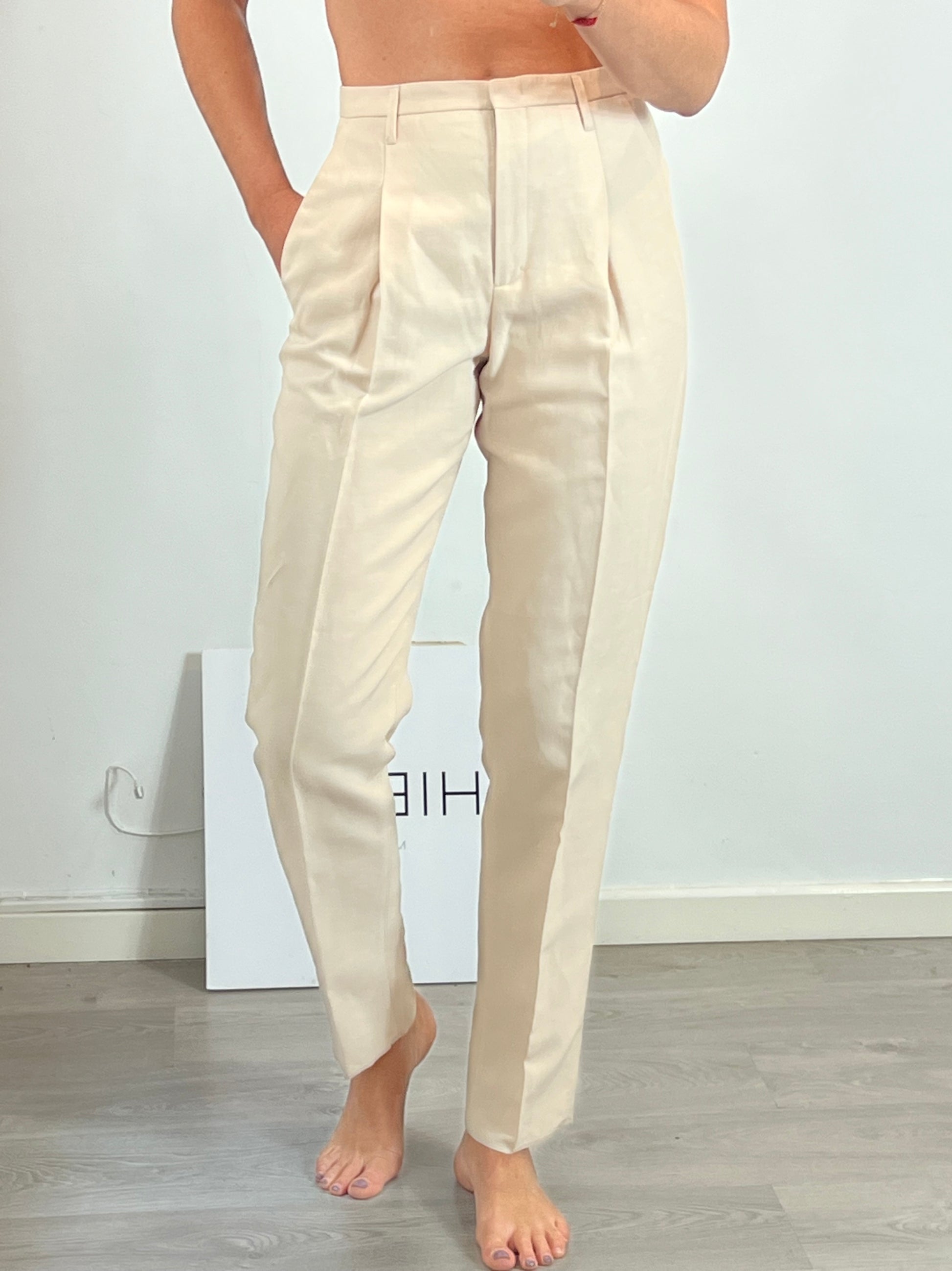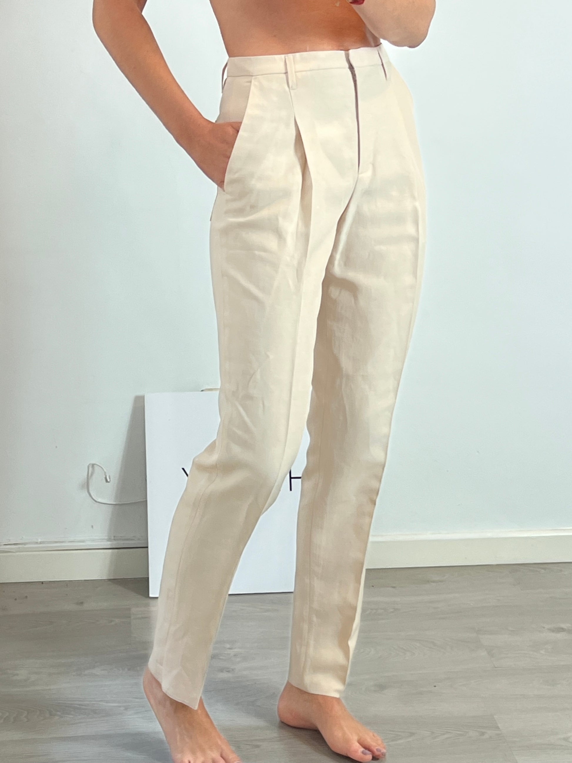 Pantalón beige pinzas. Parece lino pero tiene la etiqueta interior cortada. Cintura 37cm, largo 107cm
