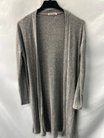 Chaqueta larga gris de punto de canalé, tiene una apertura laterales y no se abrocha