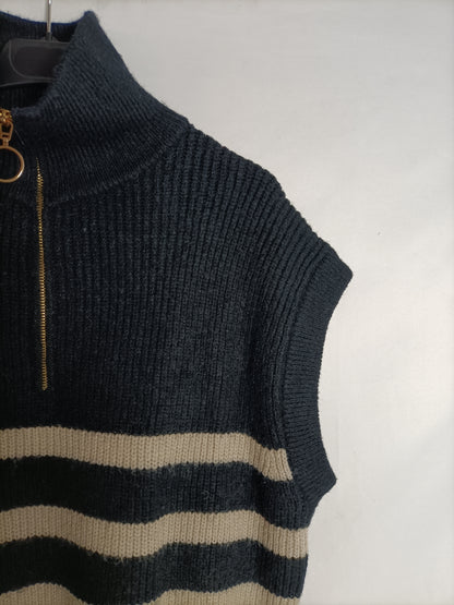 Chaleco negro con rayas blancas. Detalle de cremallera.