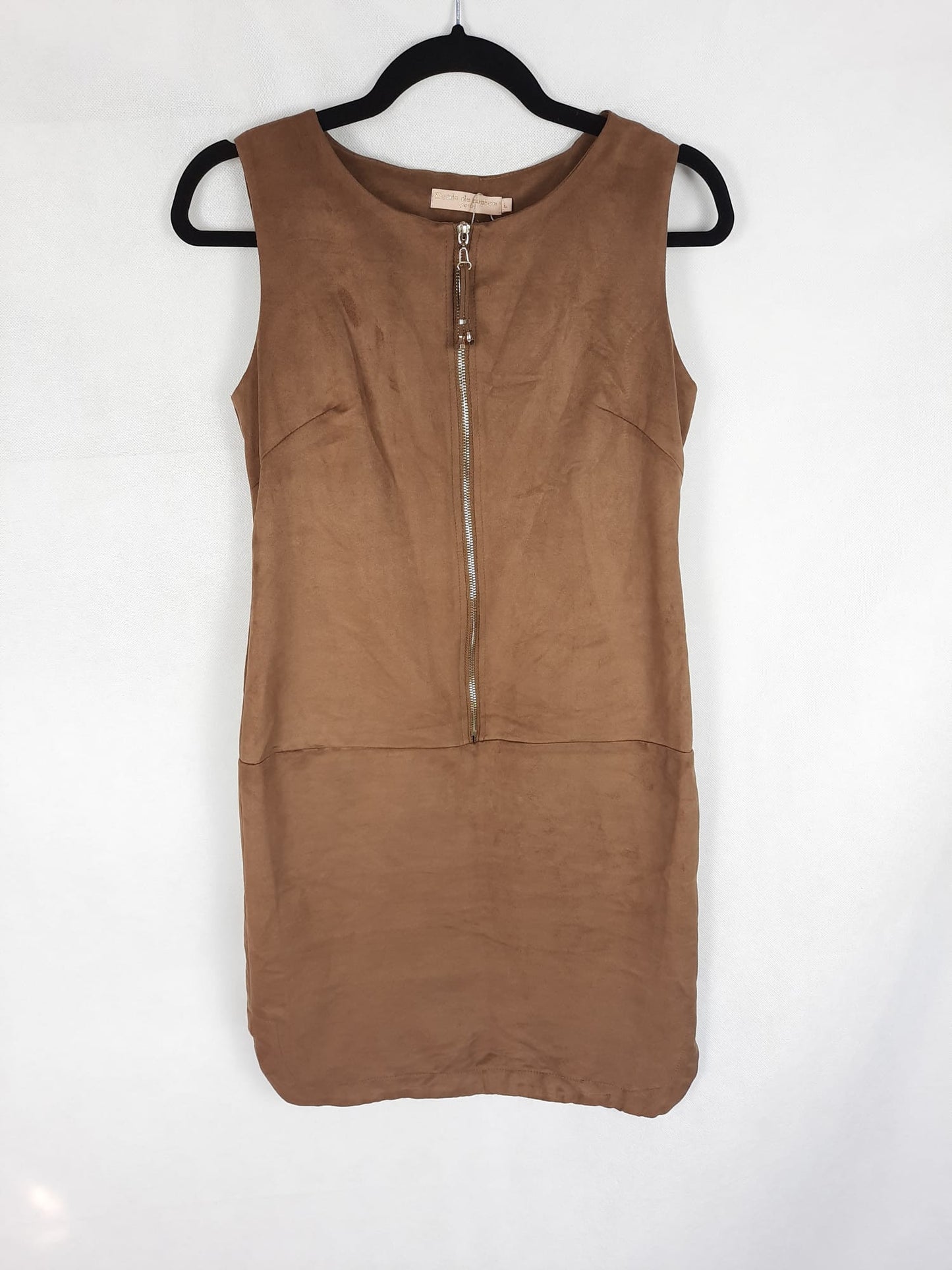 Vestido marrón de antelina no elástico con cremallera por delante. De sisa a sisa 45 cm y de largo 87. No es elástico.
