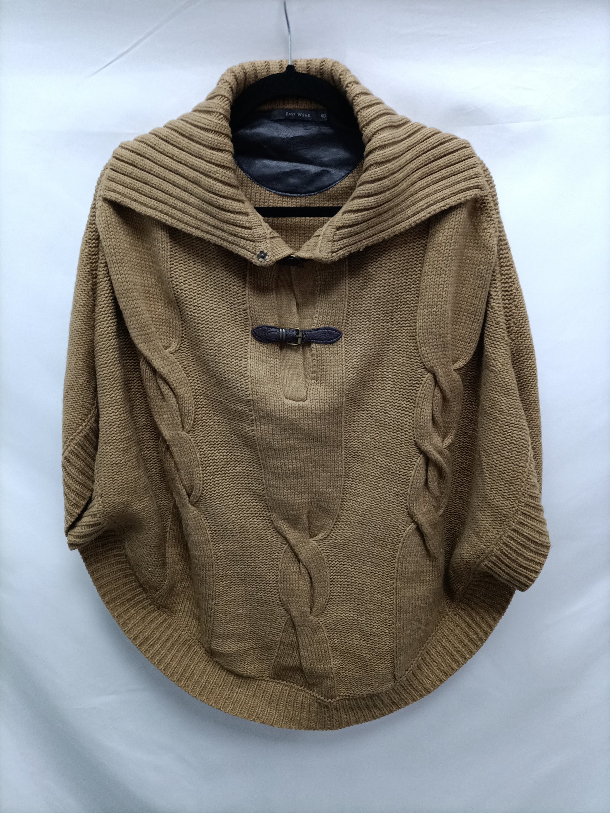 Jersey de punto beige tipo poncho con detalle de hebillas y cuello amplio. largo 76 cm Tara: Interior de polipiel un poco dañada. No se ve desde el exterior.