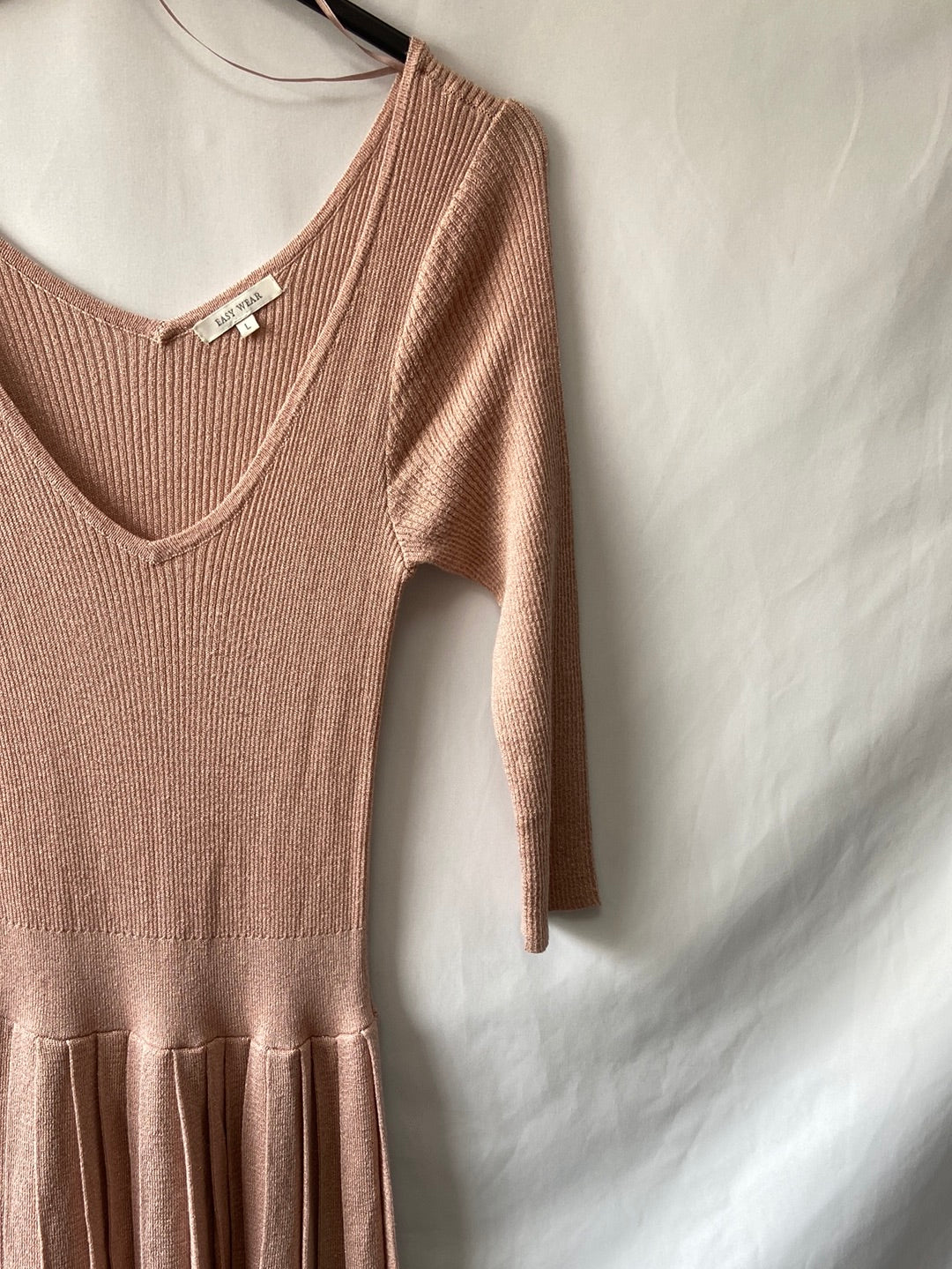 EASY WEAR. Vestido rosa con brillantina escote pico parte de abajo estampado tipo tablas largo 104 ancho 41