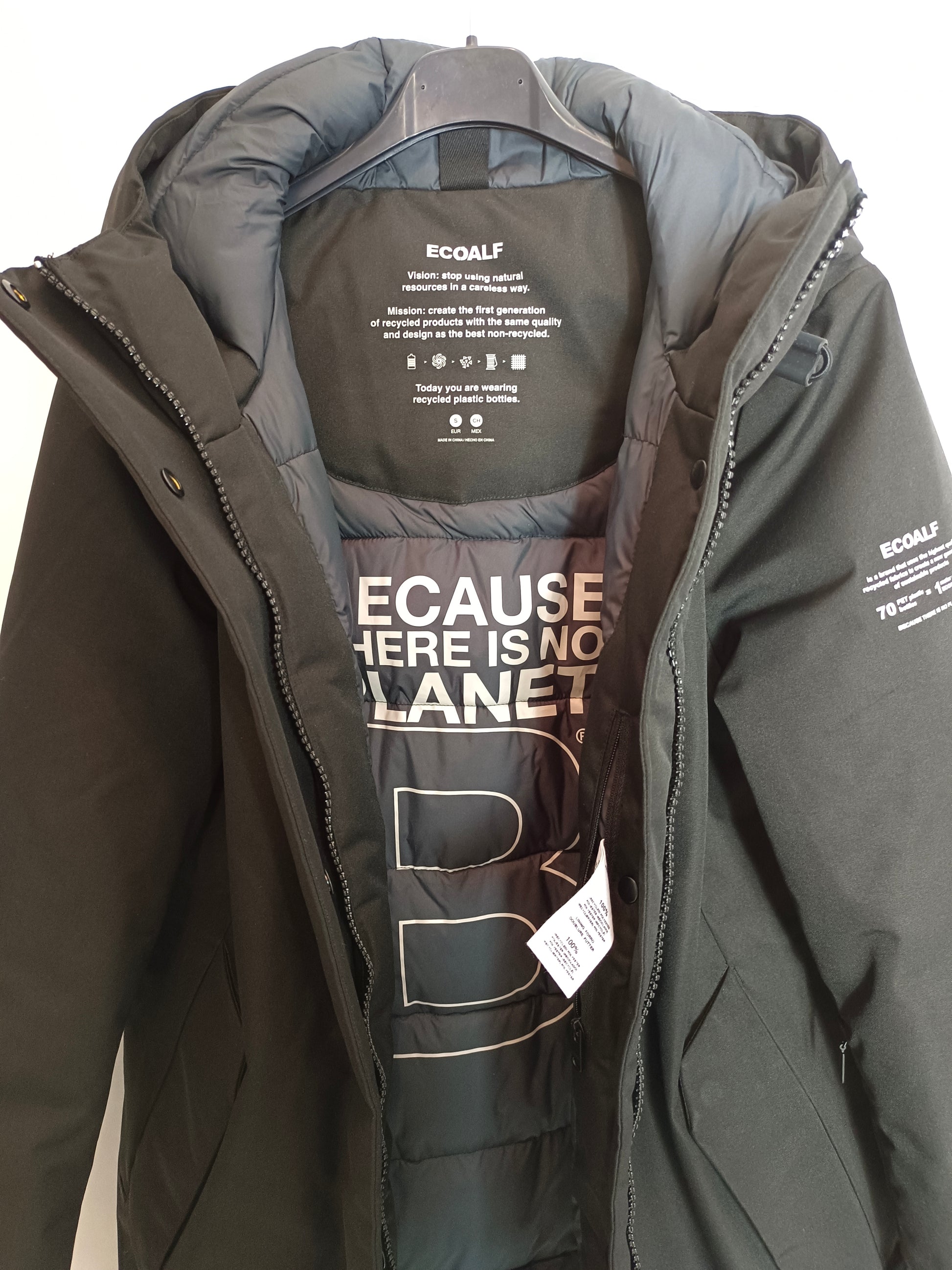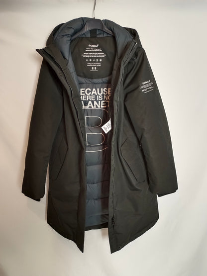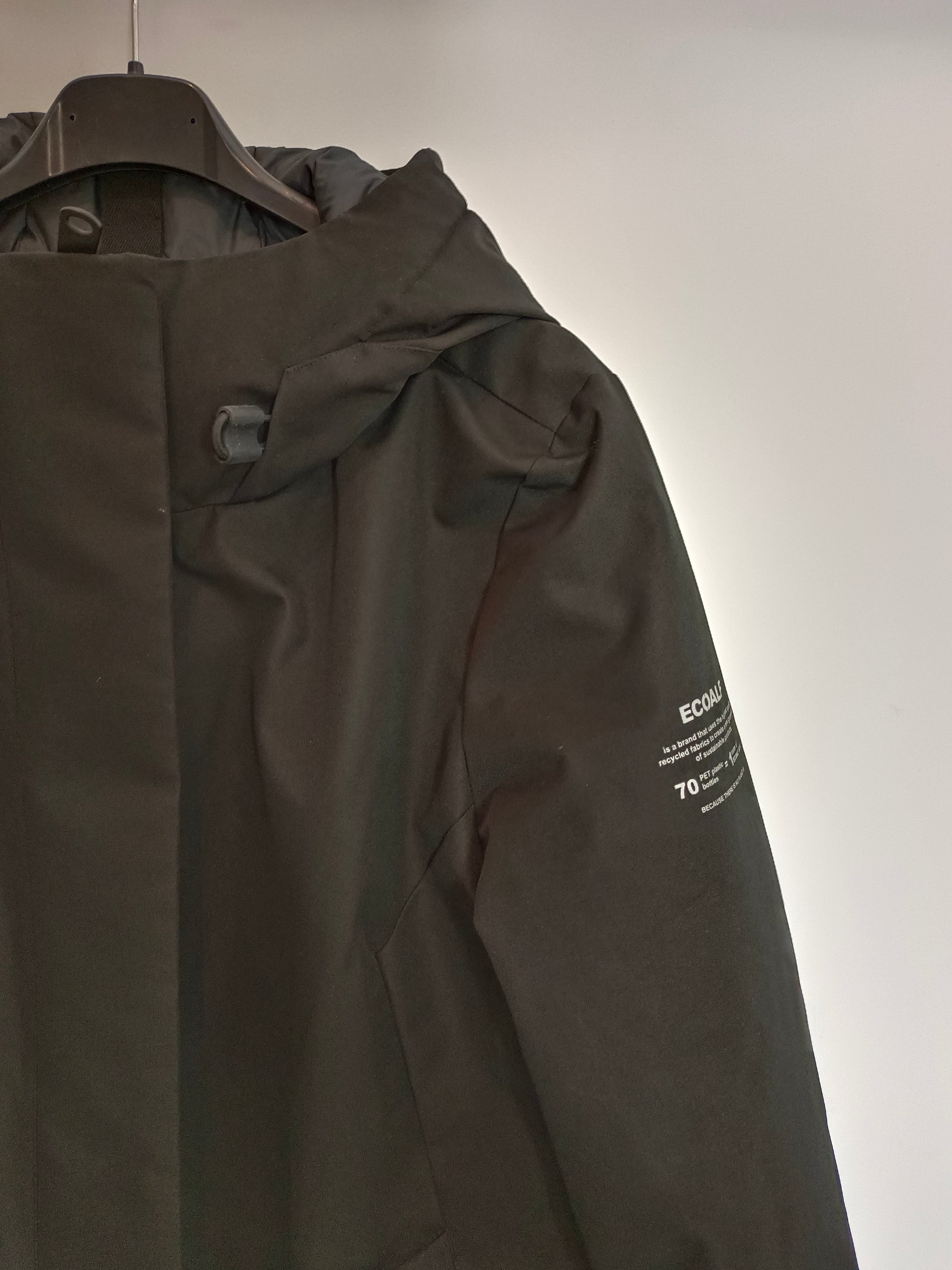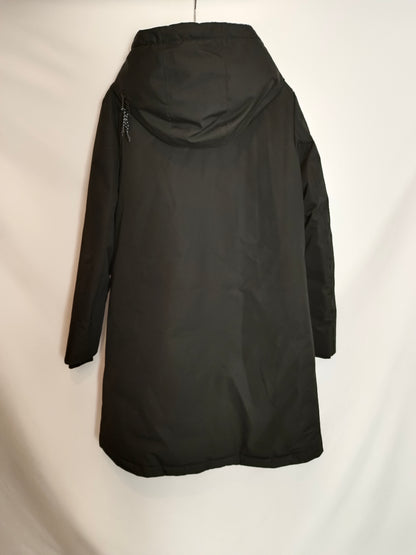 Abrigo negro estilo parka. Impermeable con capucha.De sisa a sisa 54 cm largo 90 cm