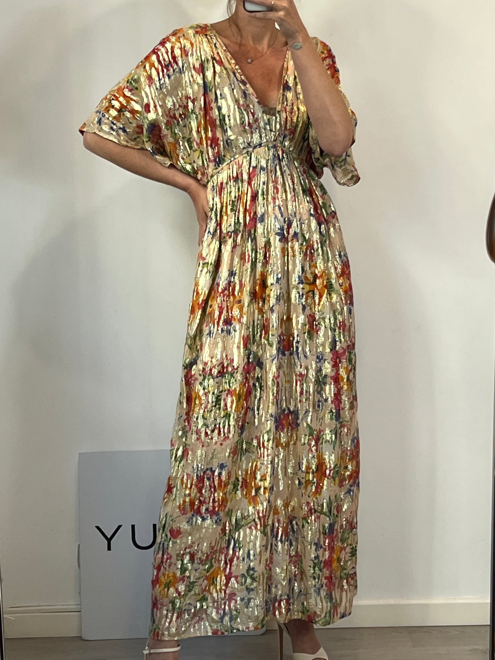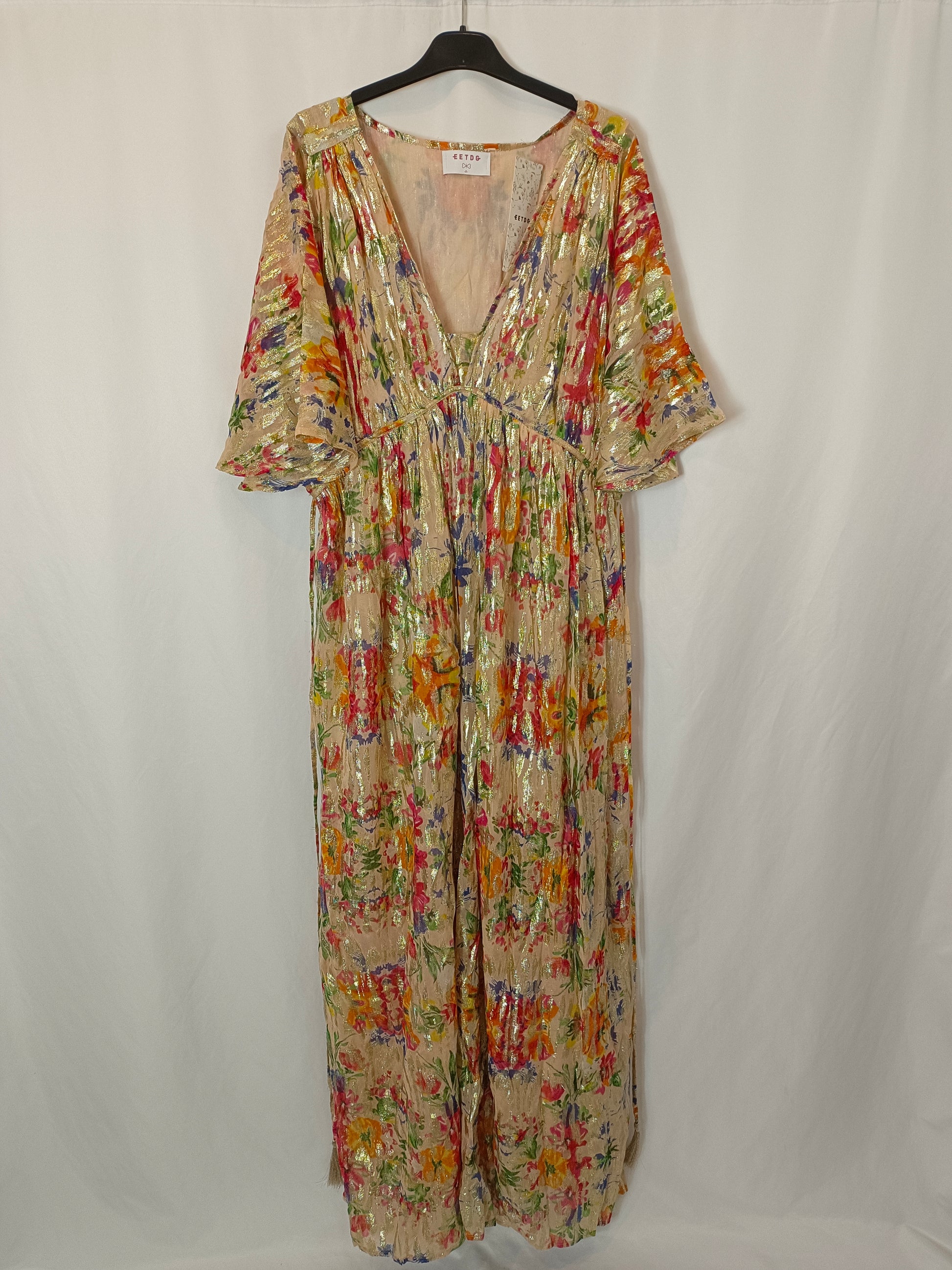 NUEVO CON ETIQUETA. vestido largo beige con estampado de colores e hilos dorados. De sisa a sisa 52cm, largo 147cm. Tiene unas tiras justo abajo del pecho para ajuste