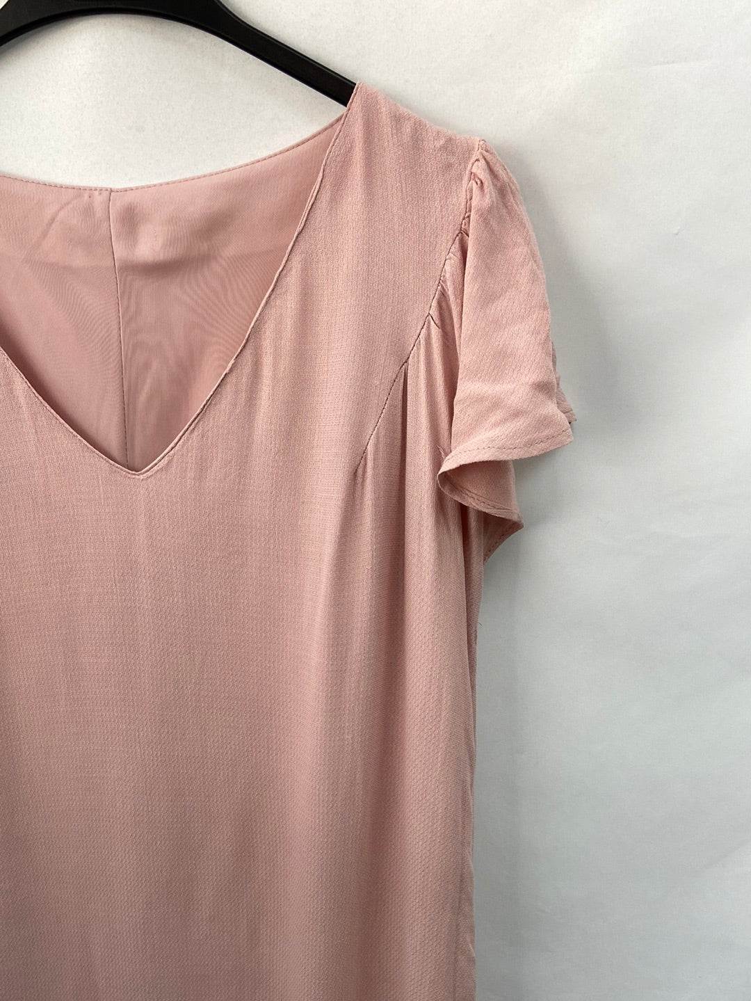Vestido corto rosa palo. Escote en pico. Volantes en las mangas. Forro interior. No es elástico. De sisa a sisa 50 cm, largo 87 cm