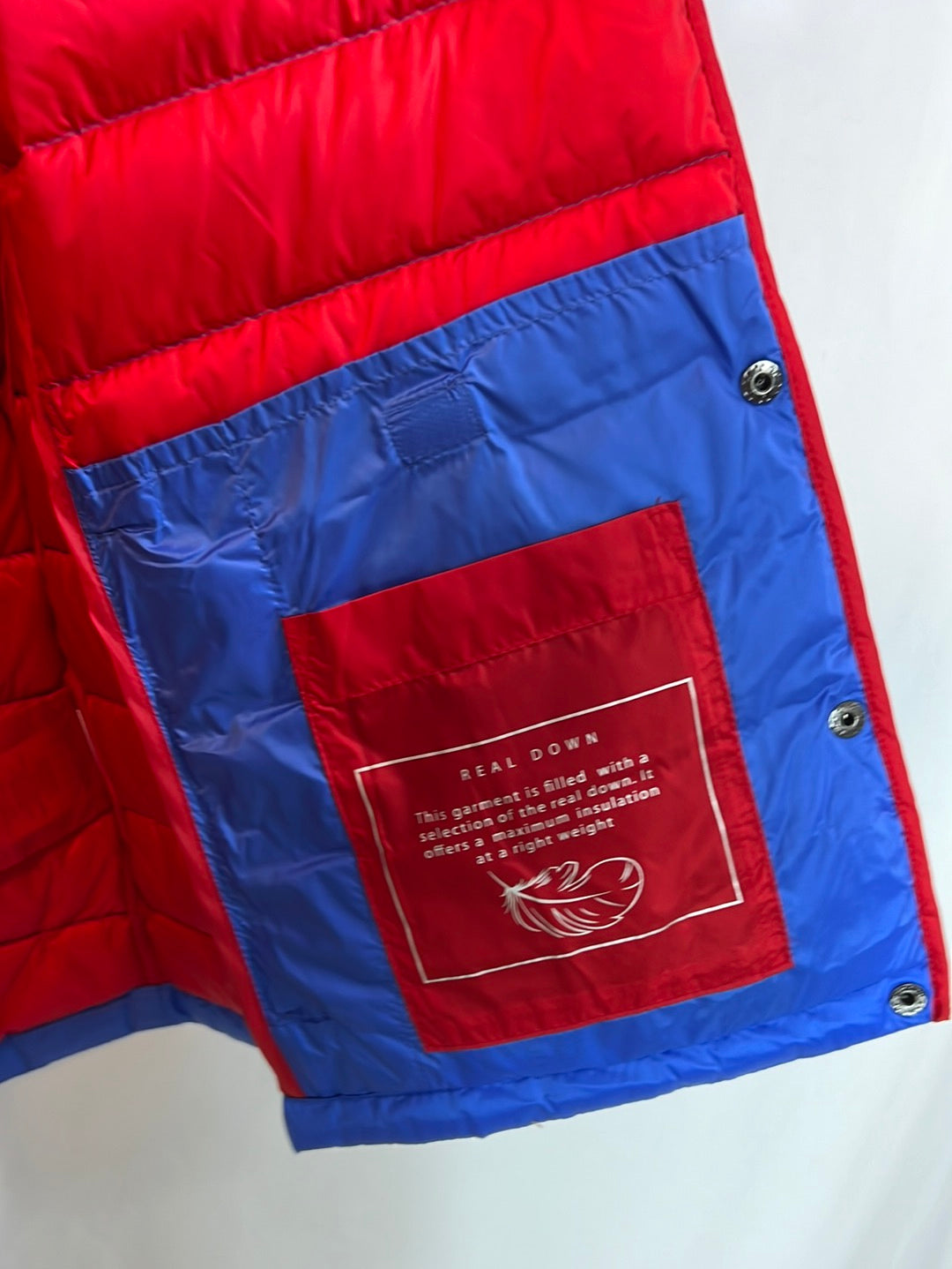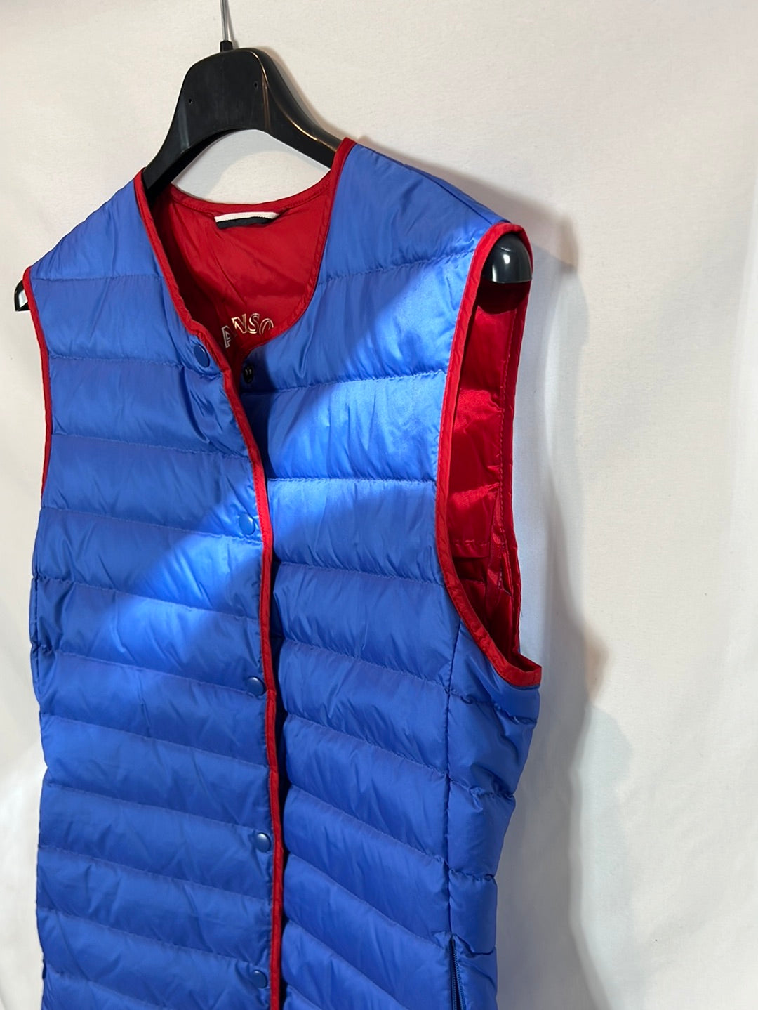Plumas sin mangas azul y rojo con funda. De sisa a sisa 44cm, largo 53cm