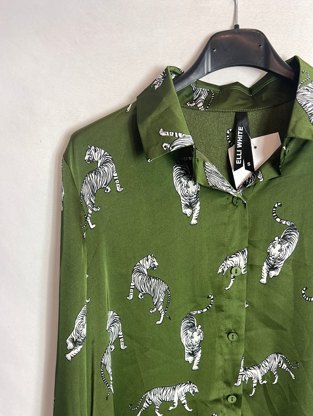 NUEVO CON ETIQUETA. Blusa verde satinada tigres. Largo 69cm