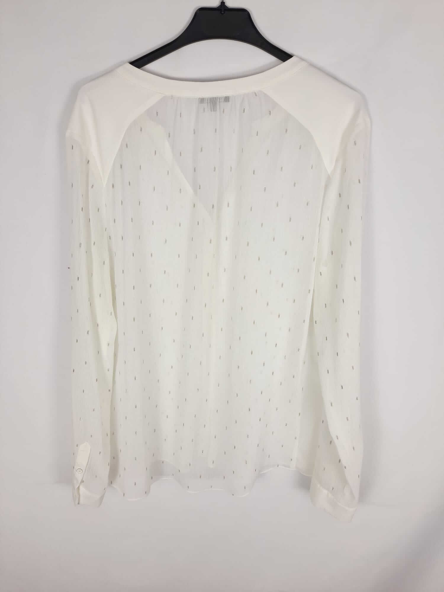 Elogy. Blusa blanca fluida y semitransparente con tejido fruncido y plumeto plateado. Semielastica. De sisa a sisa 58 cm largo 71 cm
