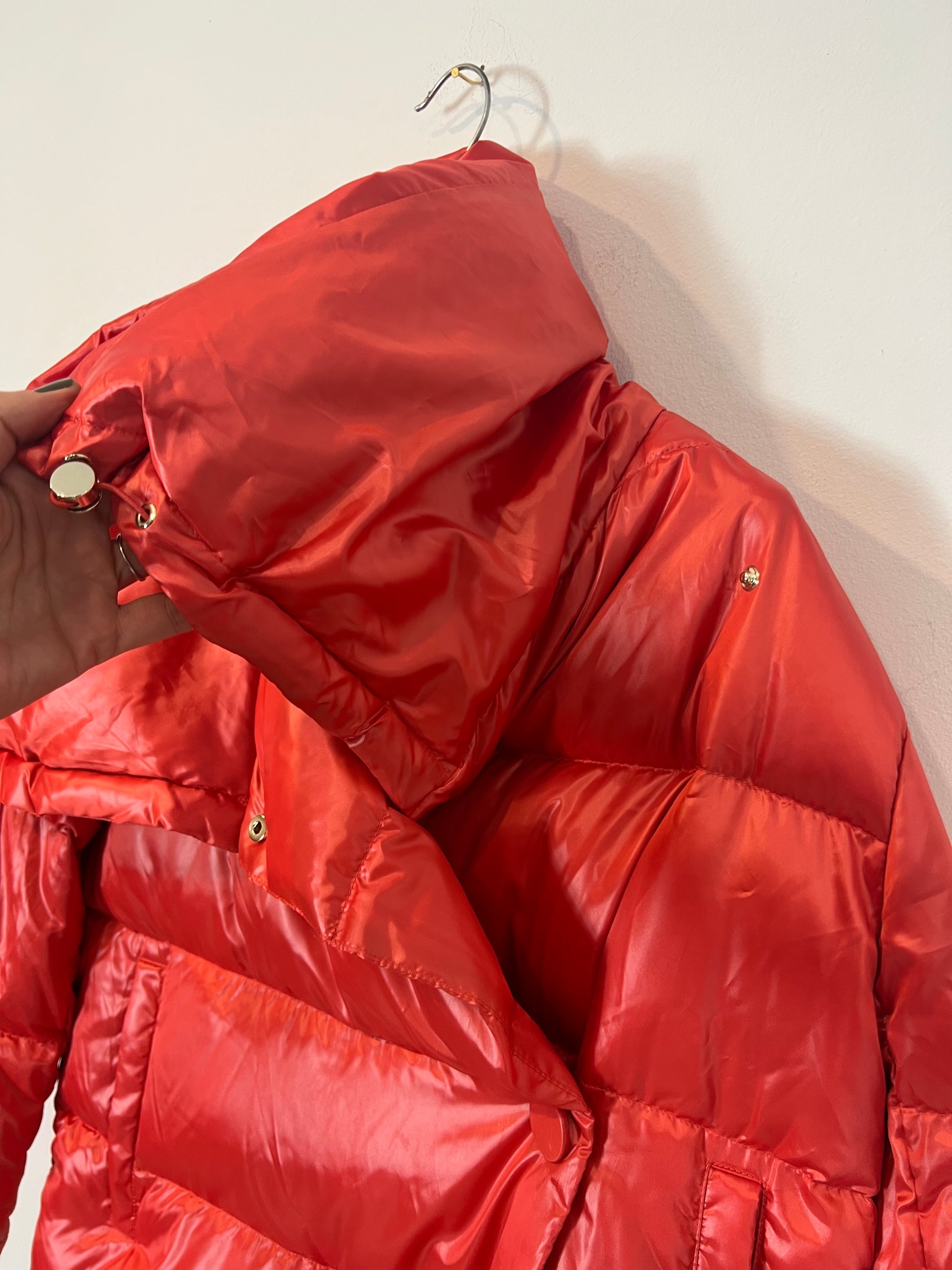 Plumífero rojo metalizado cruzado. De sisa a sisa 60cm, largo 56cm