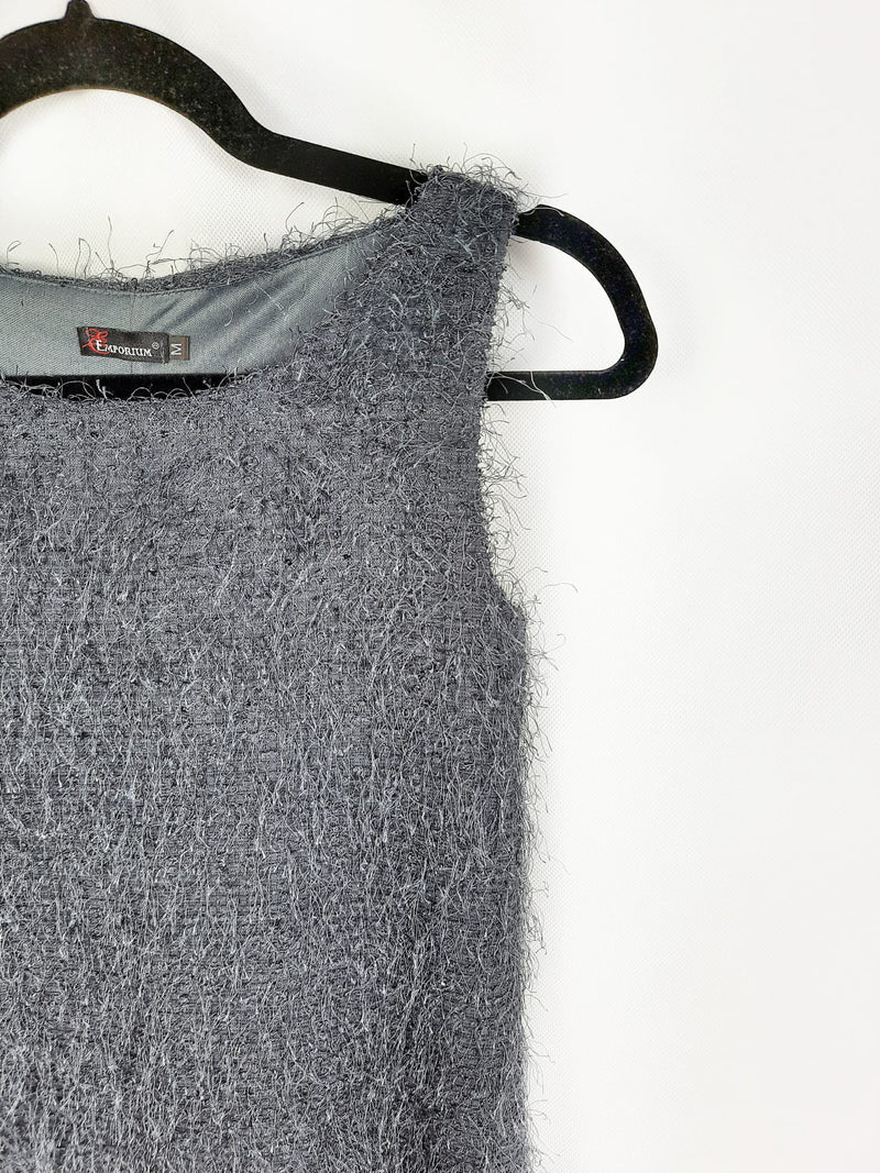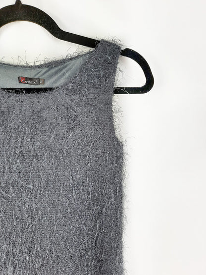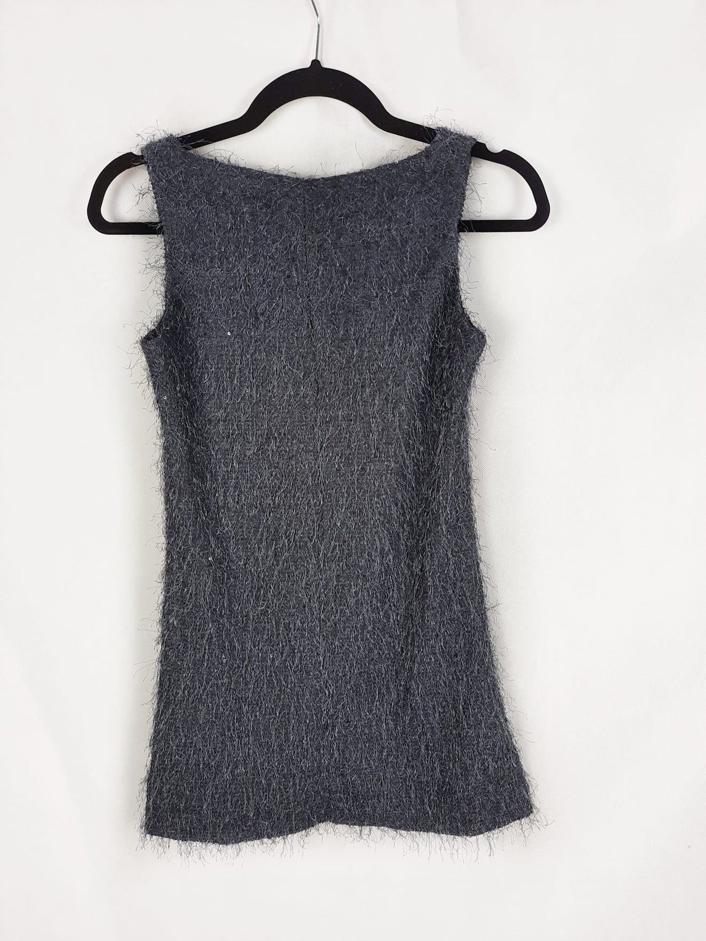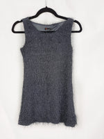 Vestido gris de flecos, es ajustado y elástico. Largo 73 cm