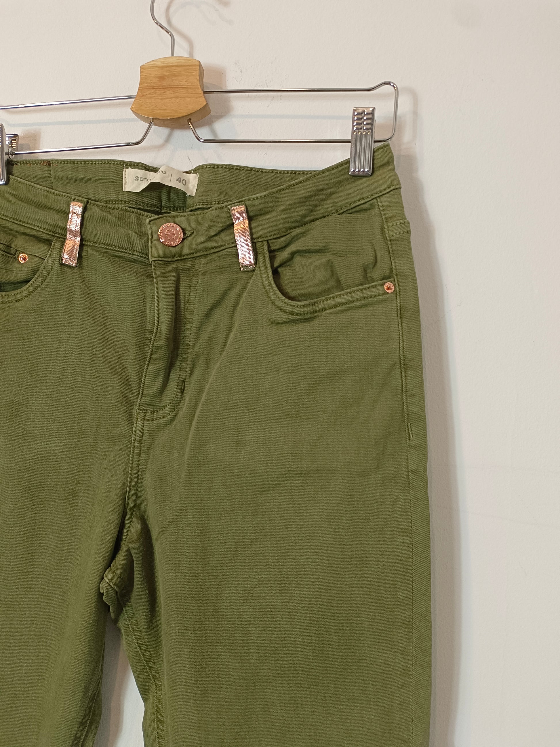 Pantalón verde tejido denim fino con detalles encaros en la cintura