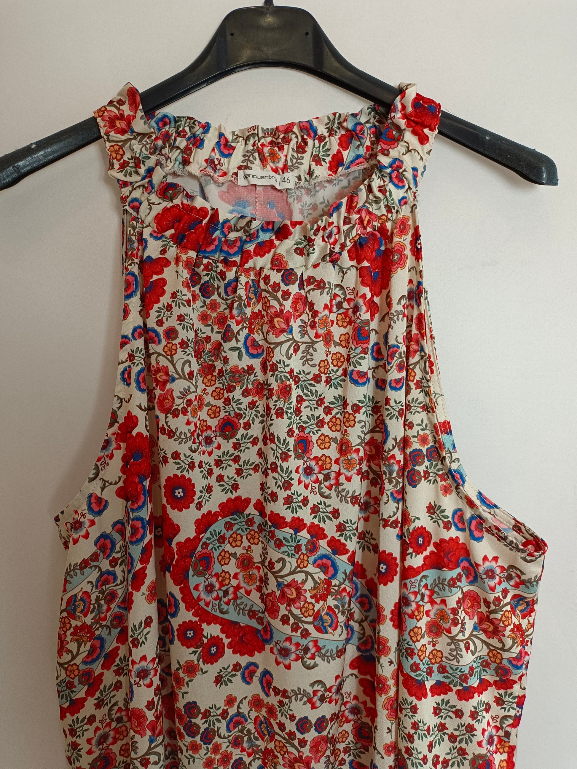 vestido largo beige con flores rojas. Escote halter. En etiqueta talla 46