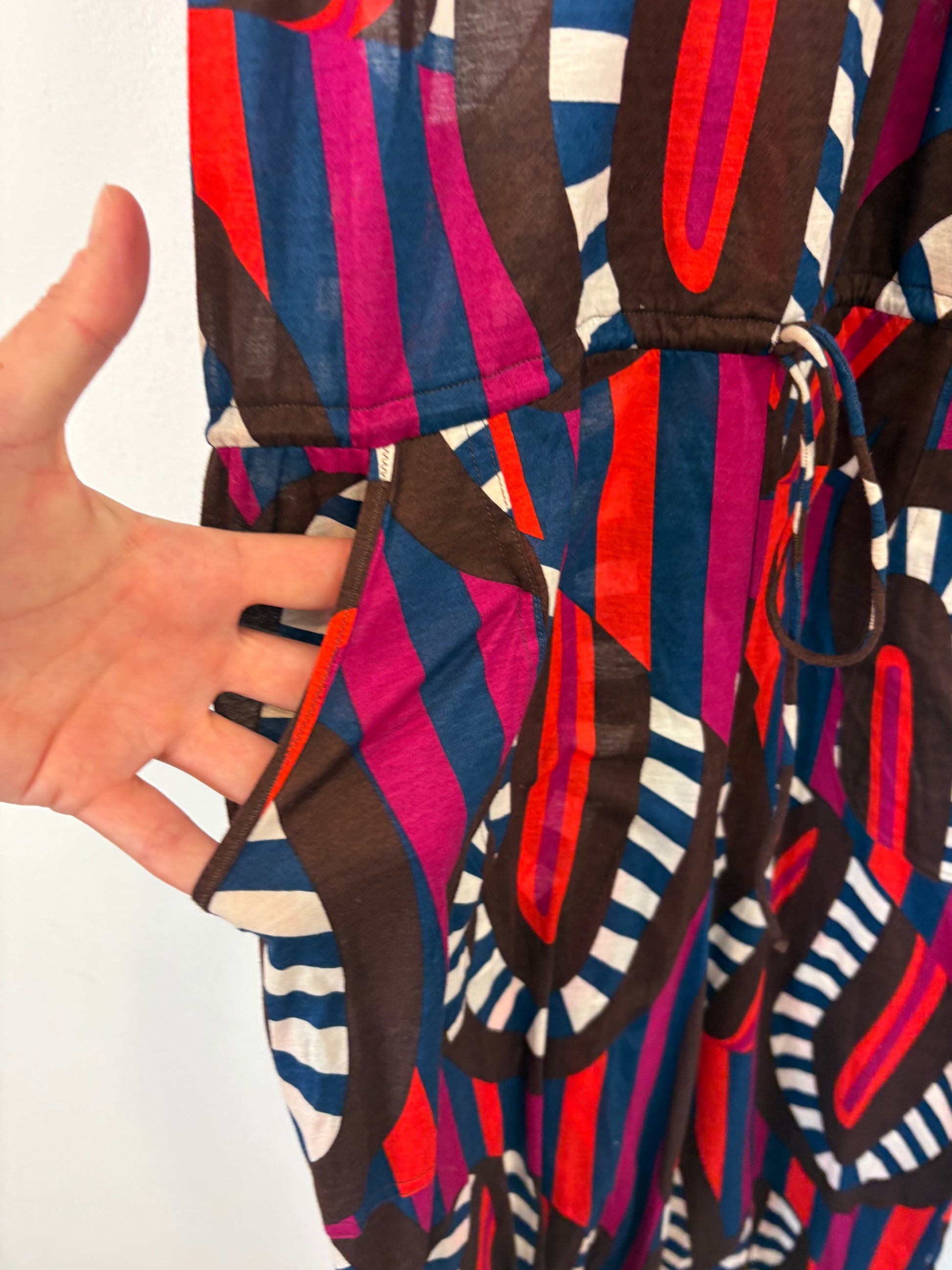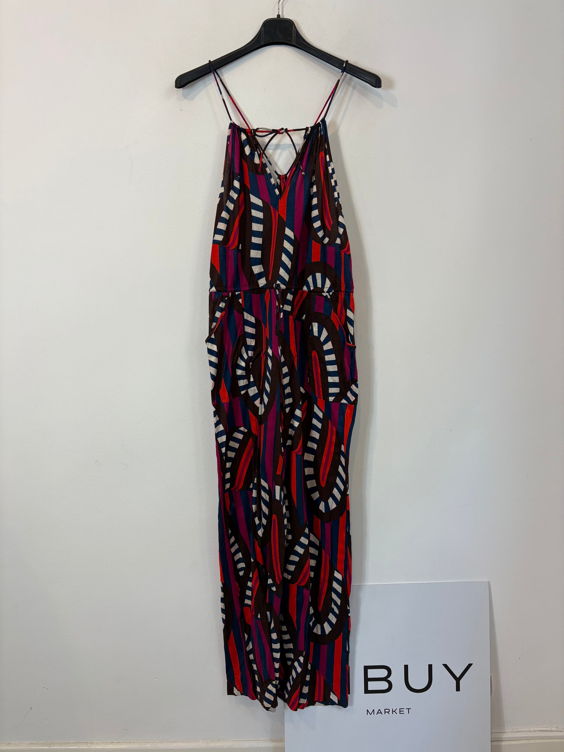 Mono estampado colores. Cintra alta regulable 40 cm, largo 148 cm. Semi elástico. Etiqueta interior cortada