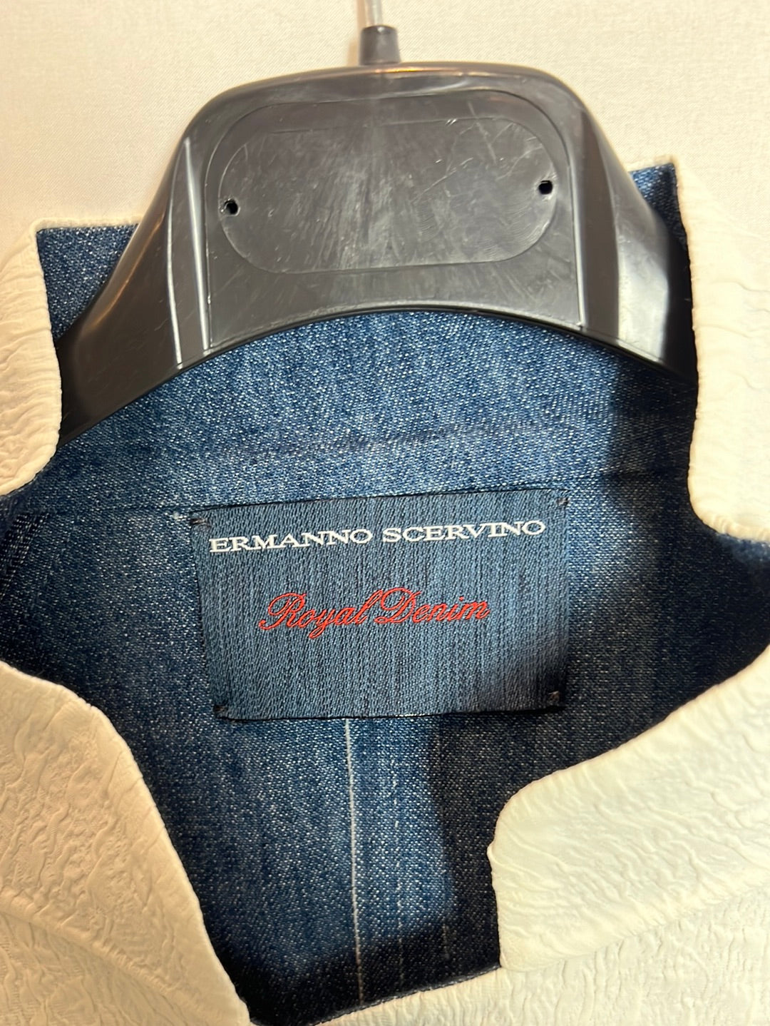 Chaqueta blanca textura con interior en denim. Si se le quitan las etiquetas podría ser reversible. De sisa a sisa 51cm, largo 63cm