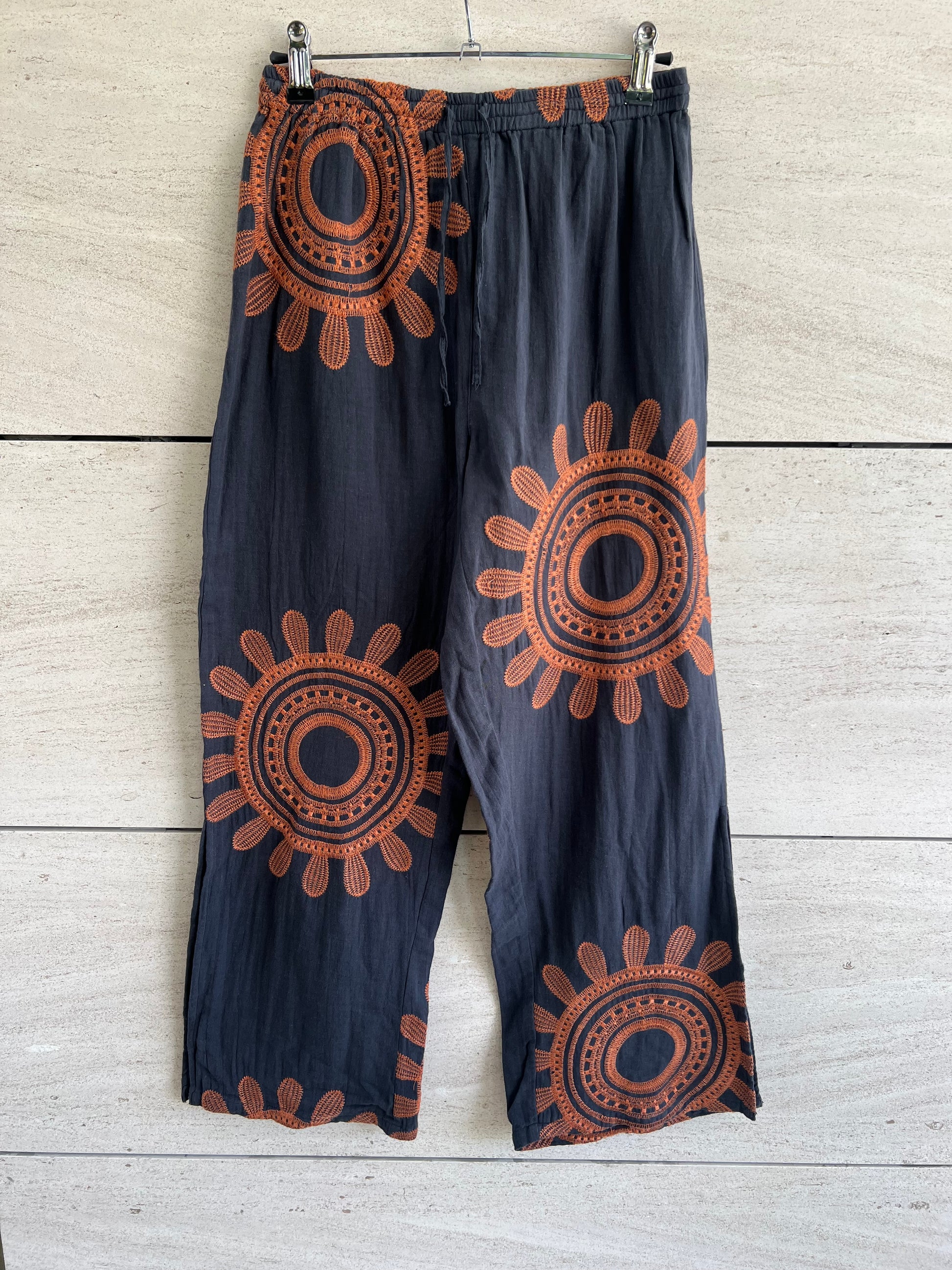 Pantalón fluido gris bordado. cintura elástica 34 cm, largo cm94.