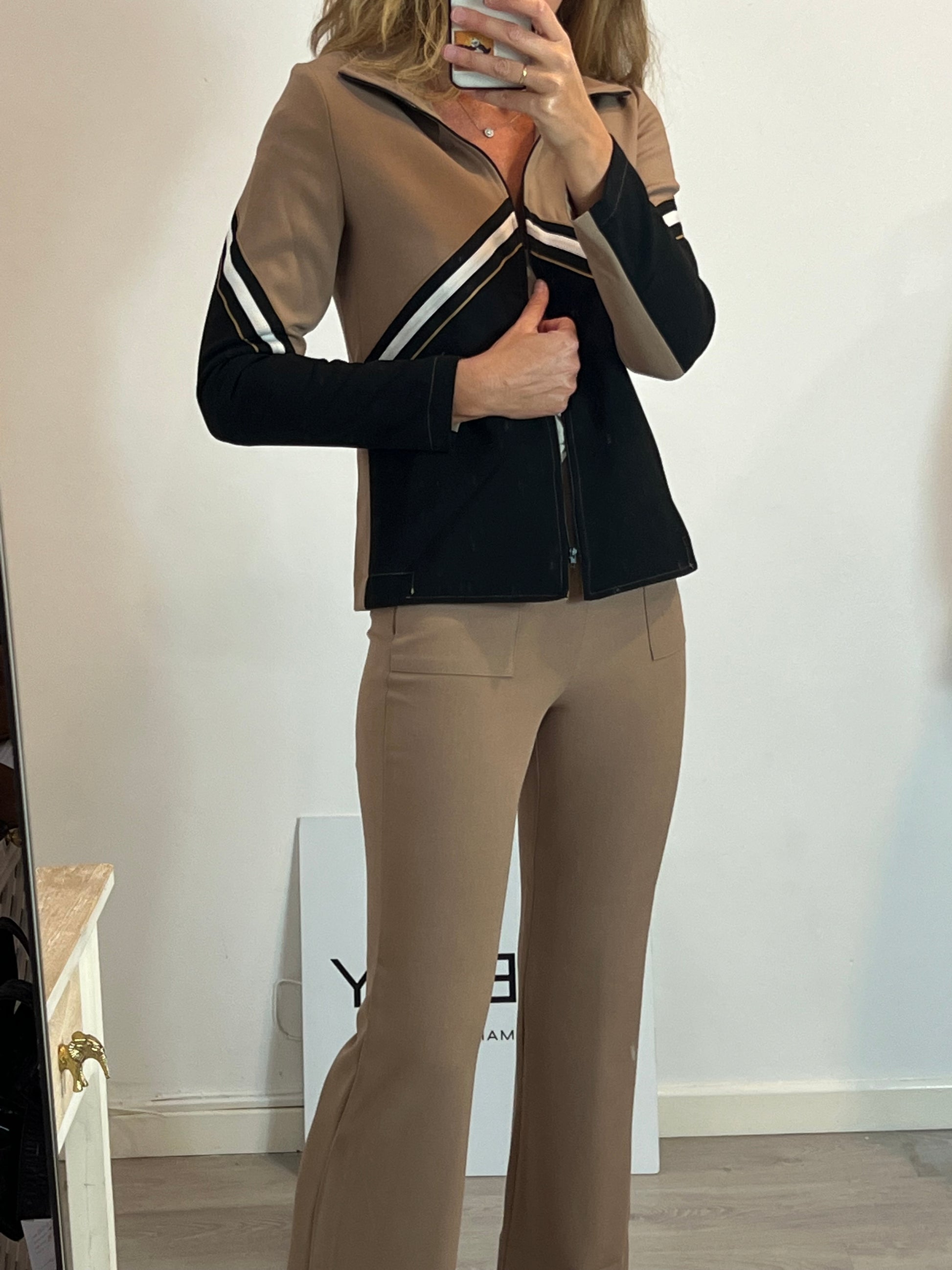 chaqueta camel con detalle de rayas en las mangas. Se abrocha con cremallera