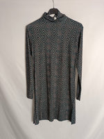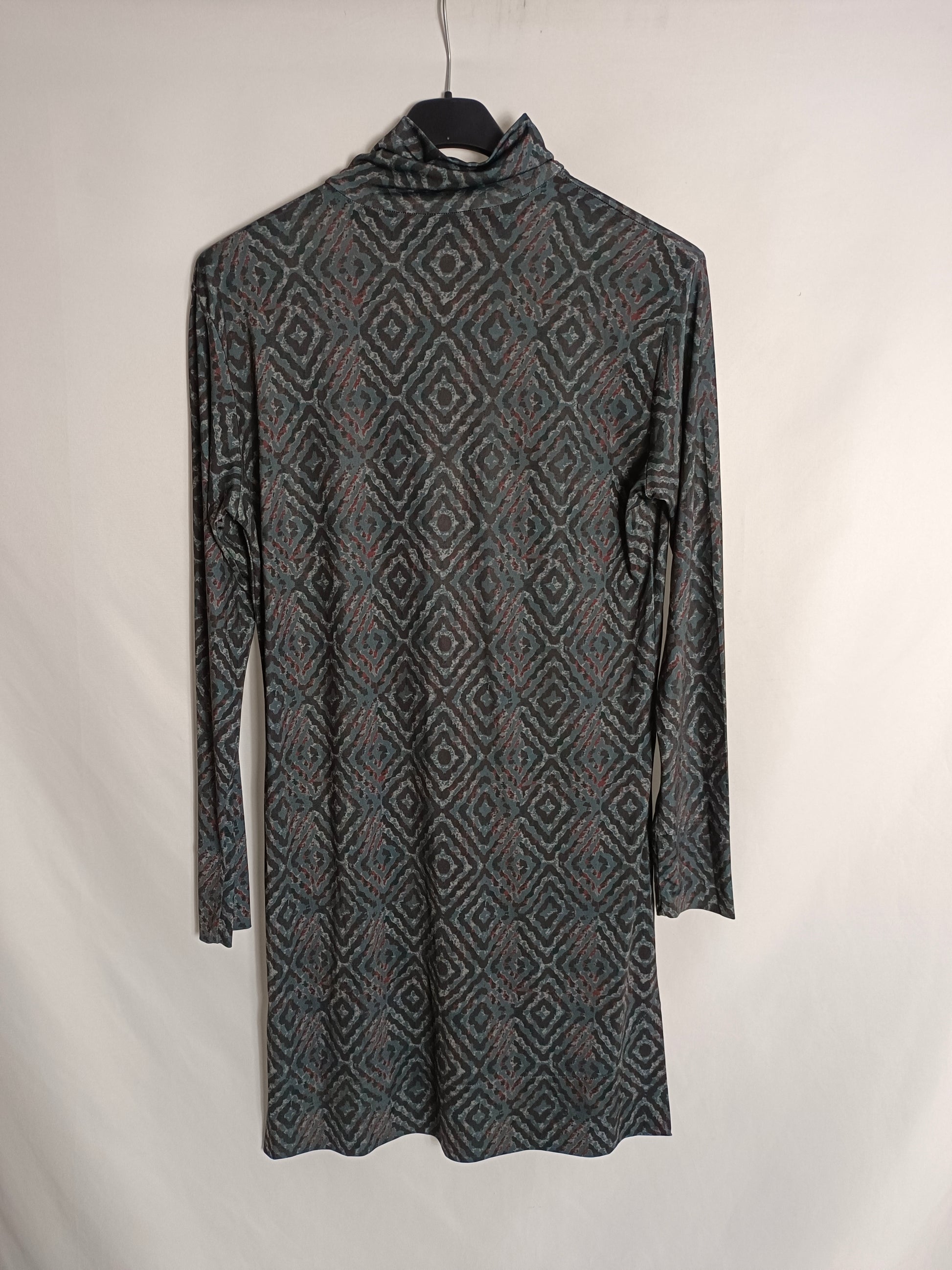 vestido corto gris estampado en marrón de tejido fino y elástico. cuello perkins.
