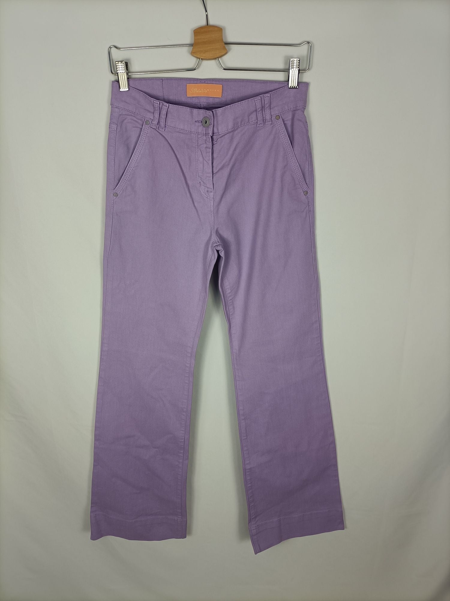 Essentiel. 36. Pantalón de campana lila tejido denim. No elástico. Cintura 36 cm largo 106 cm
