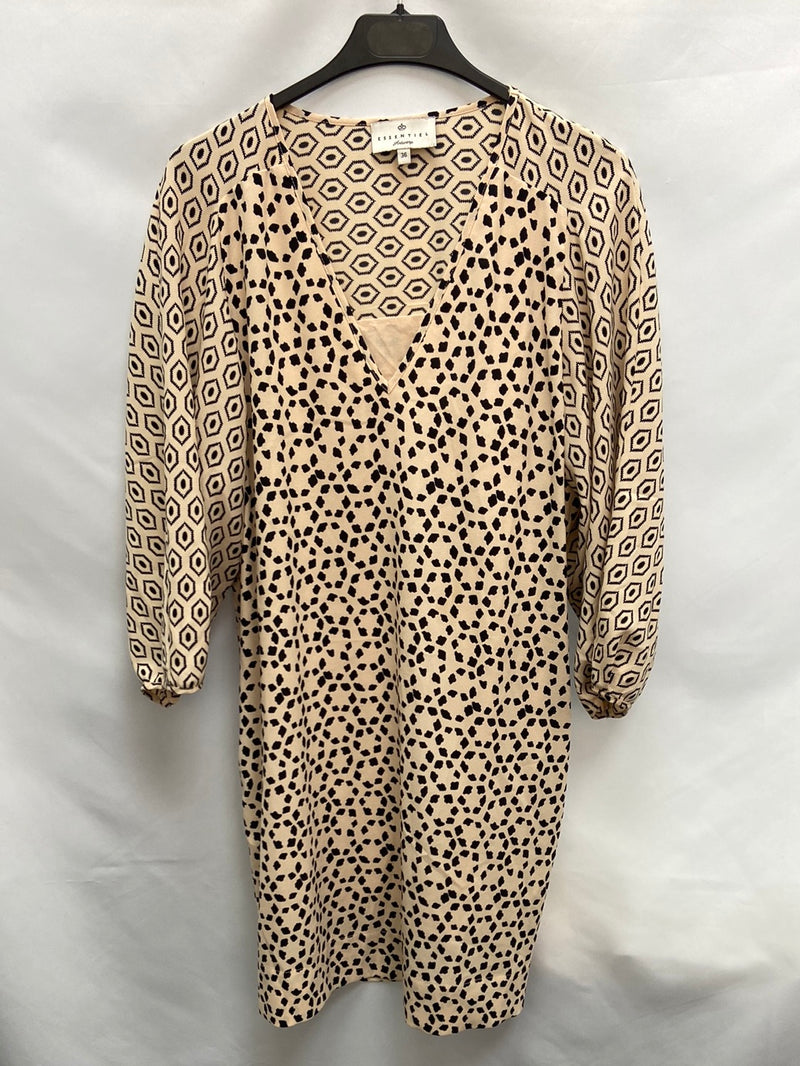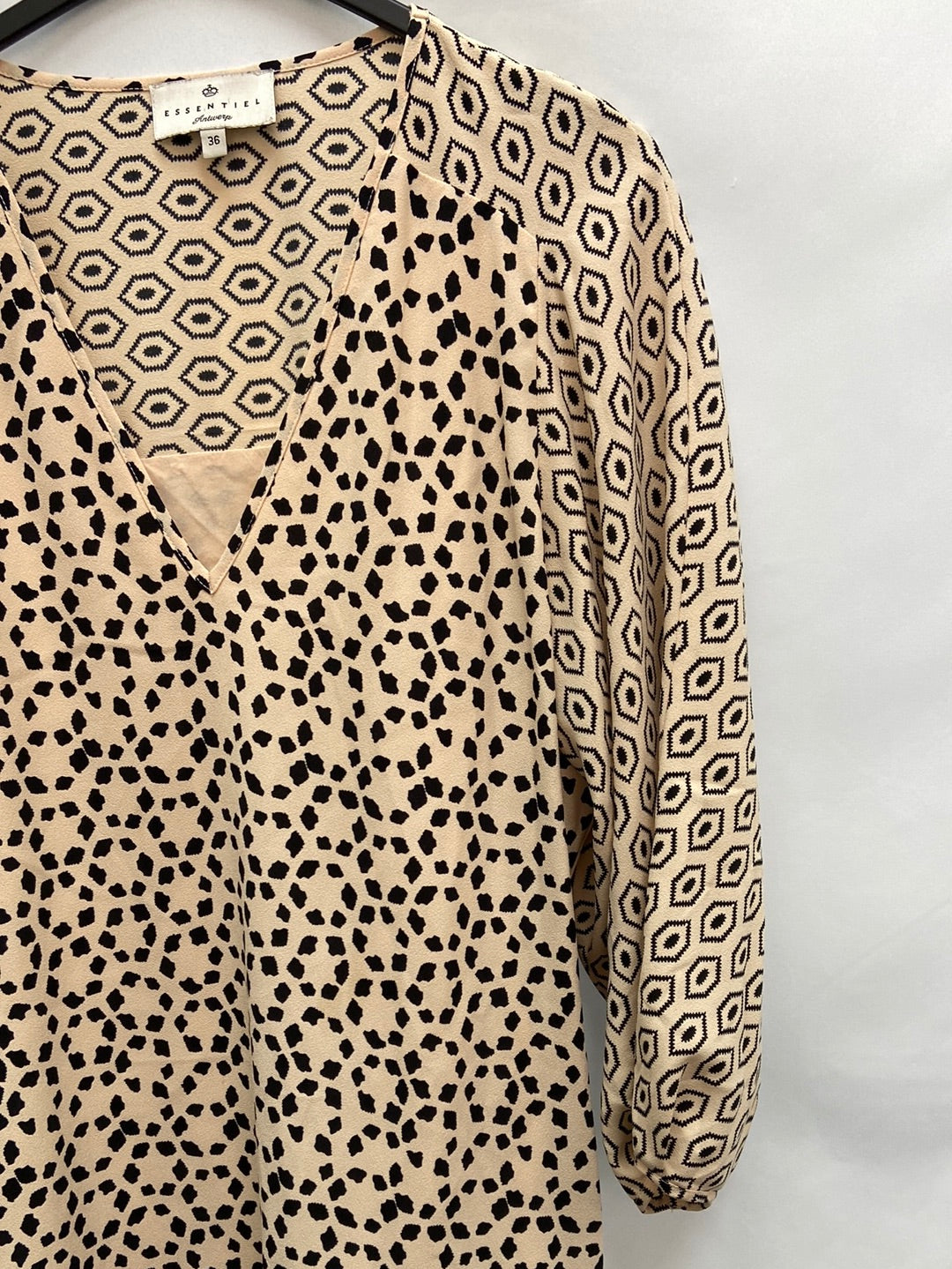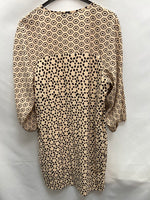 Vestido fluido con estampado de manchas negras haciendo círculos y hexágonos, mangas abombadas
