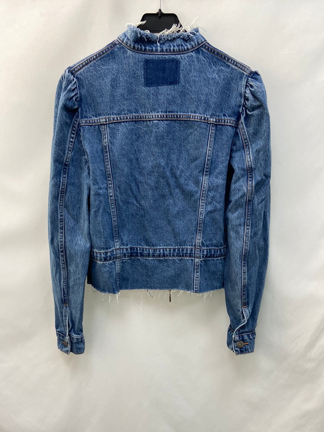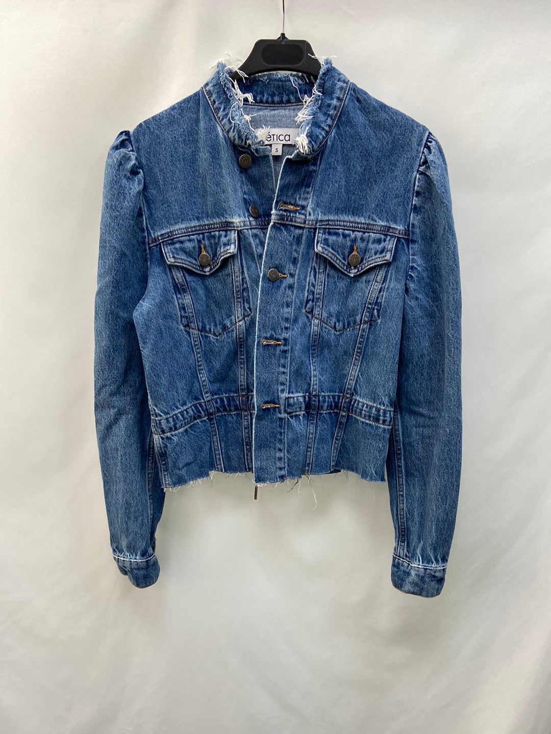 Chaqueta vaquera con cuello más detalle deshilachado y hombros ligeramente abollonadas fruncidos. De sisa a sisa 47 cm largo 55 cm