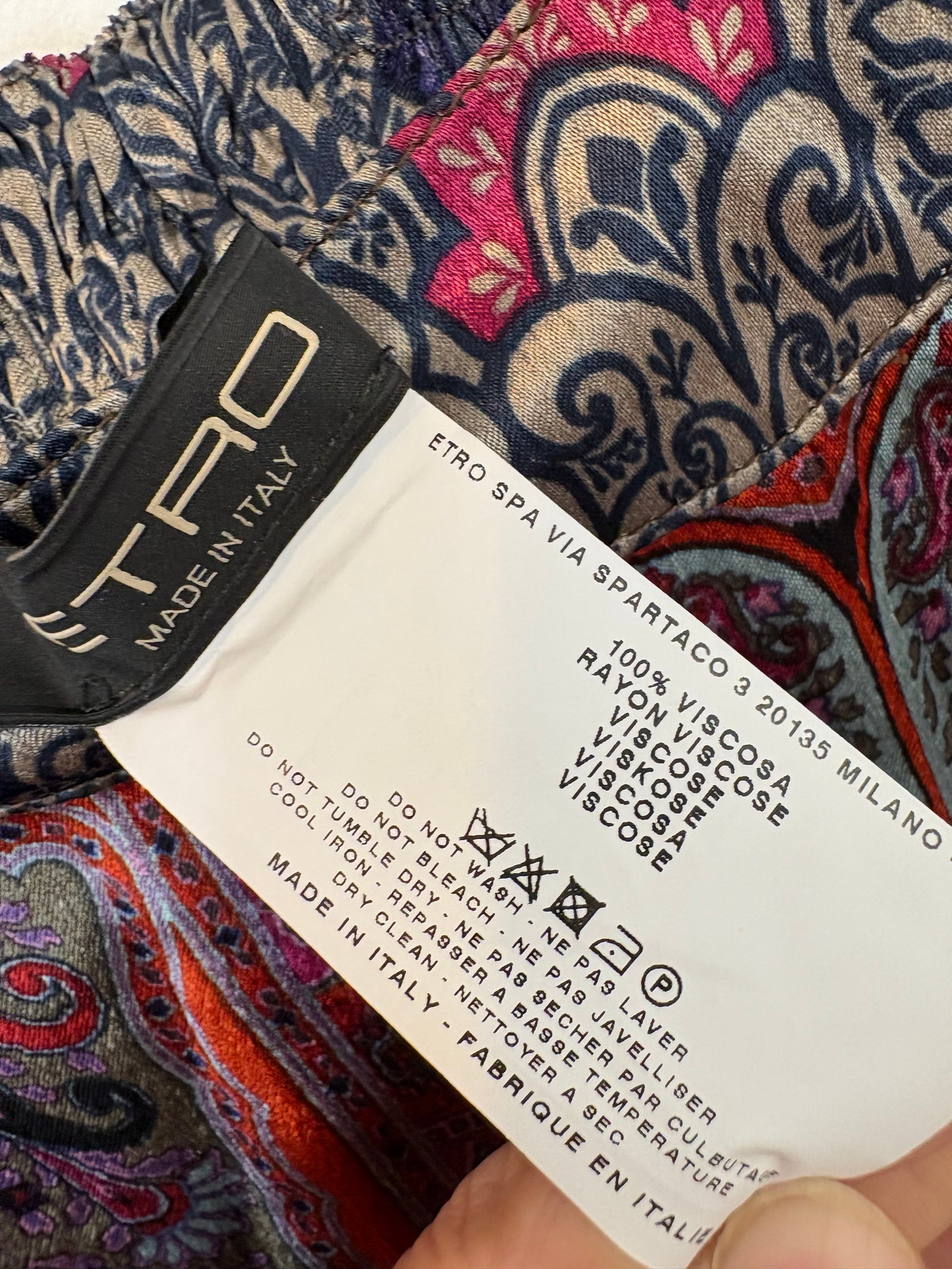 Estampad multicolor con bolsillos. Talla 38 italiana en la etiqueta, No elastico. Cintura semi elástica 35 cm, largo 112 cm