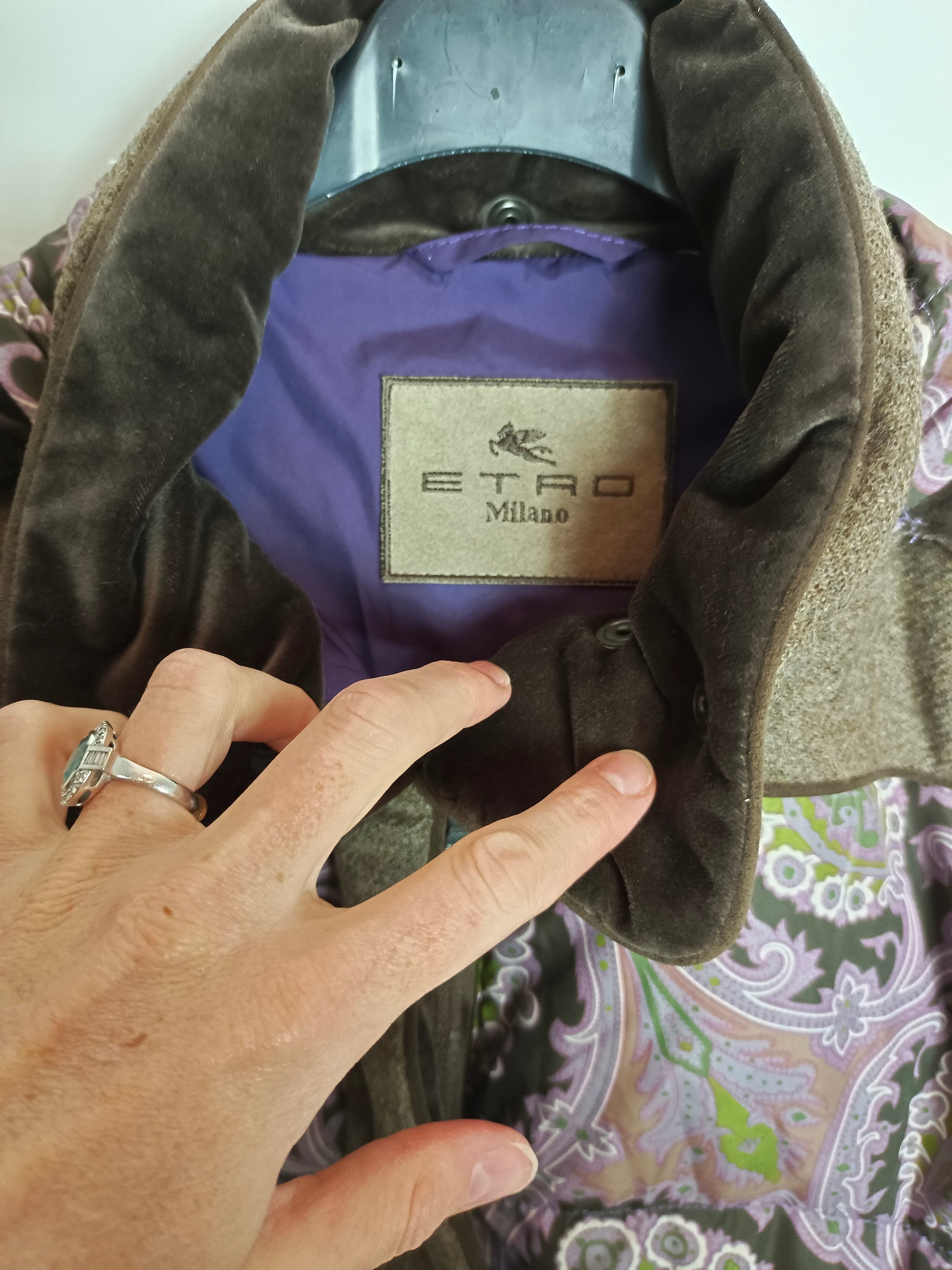 plumas estampado morado con detalles jaspeados y de terciopelo. pelo capucha 100% pelo.
