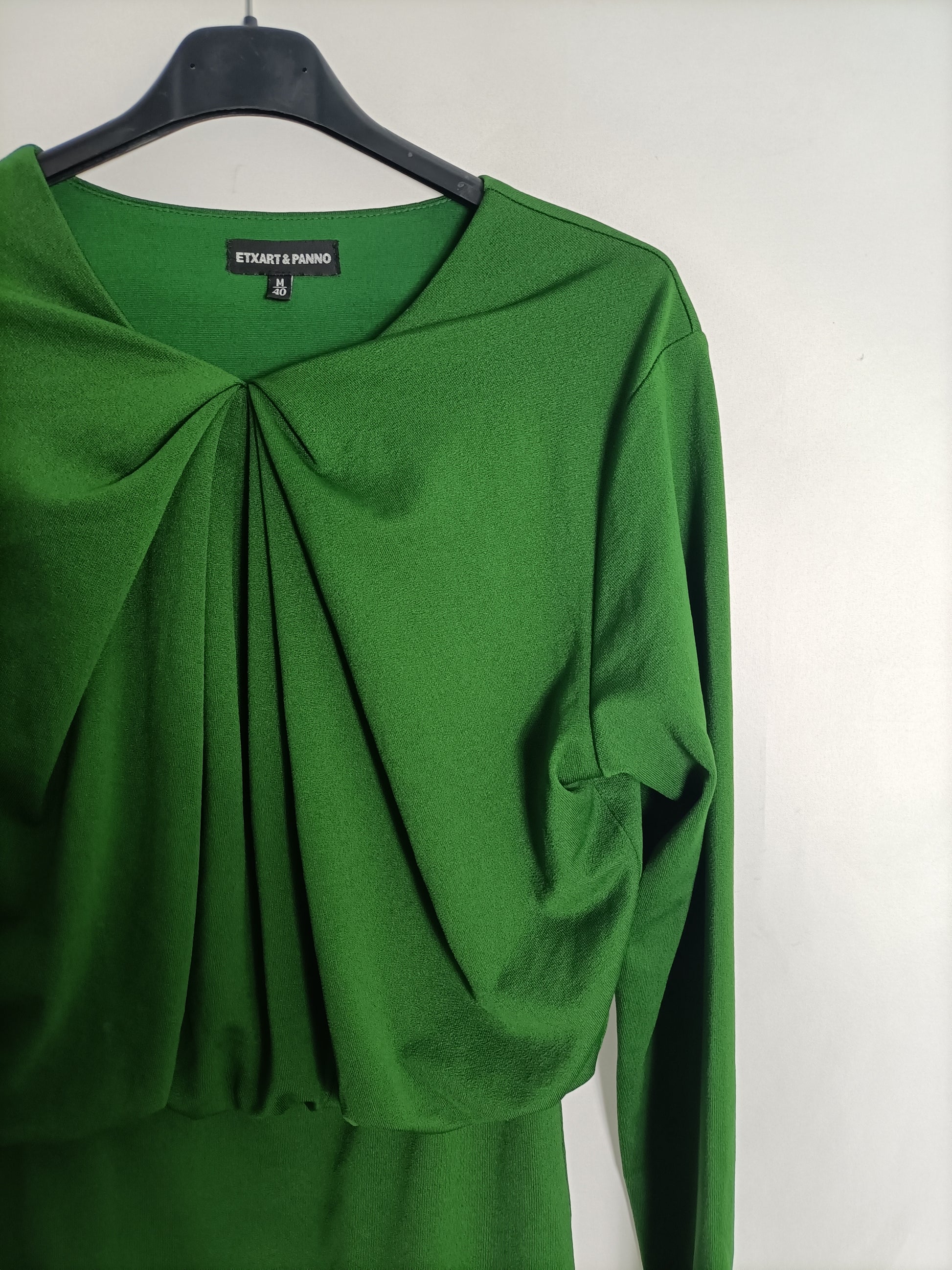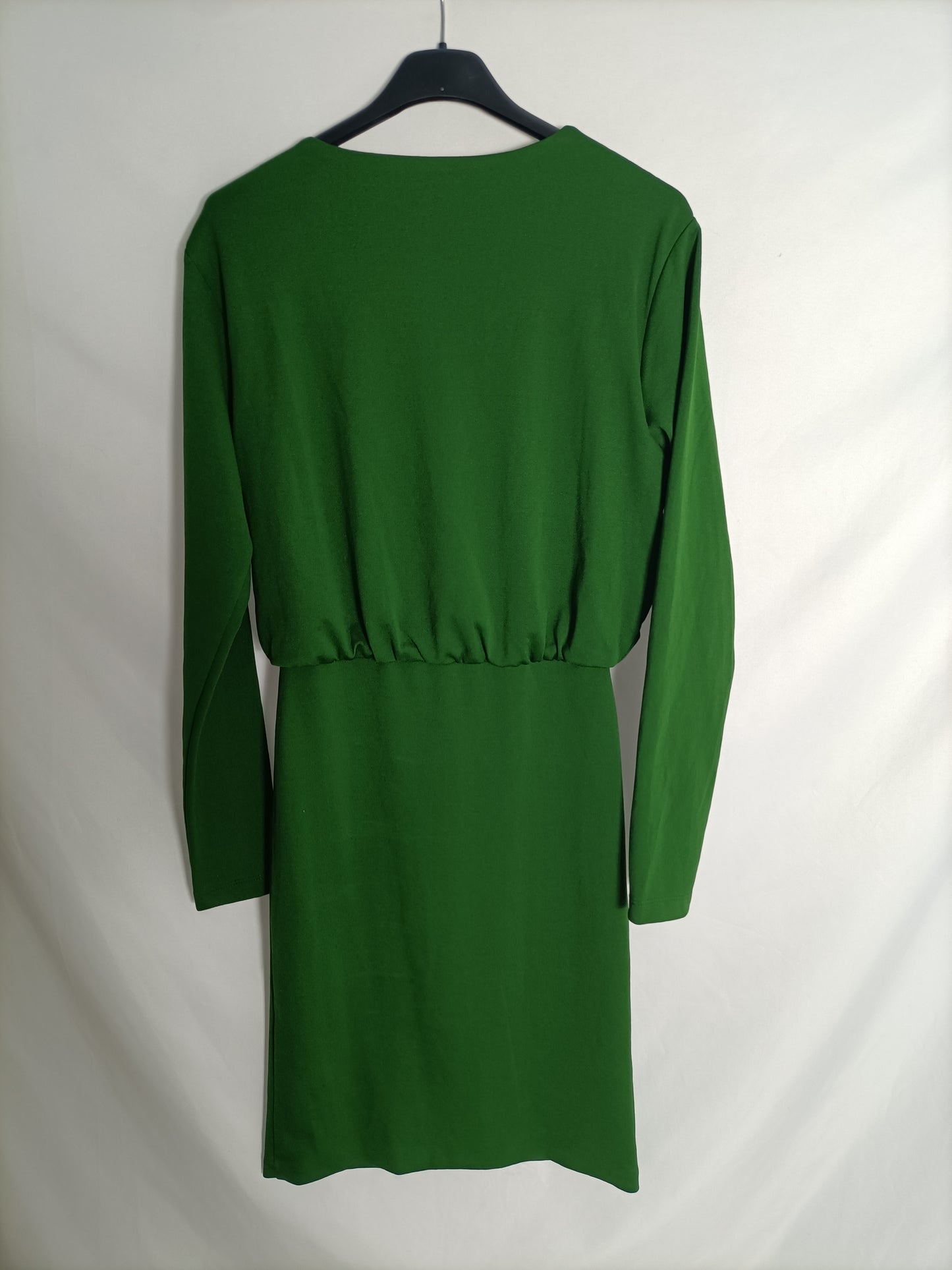Vestido verde entallado de tejido de licra con el escote fruncido.
