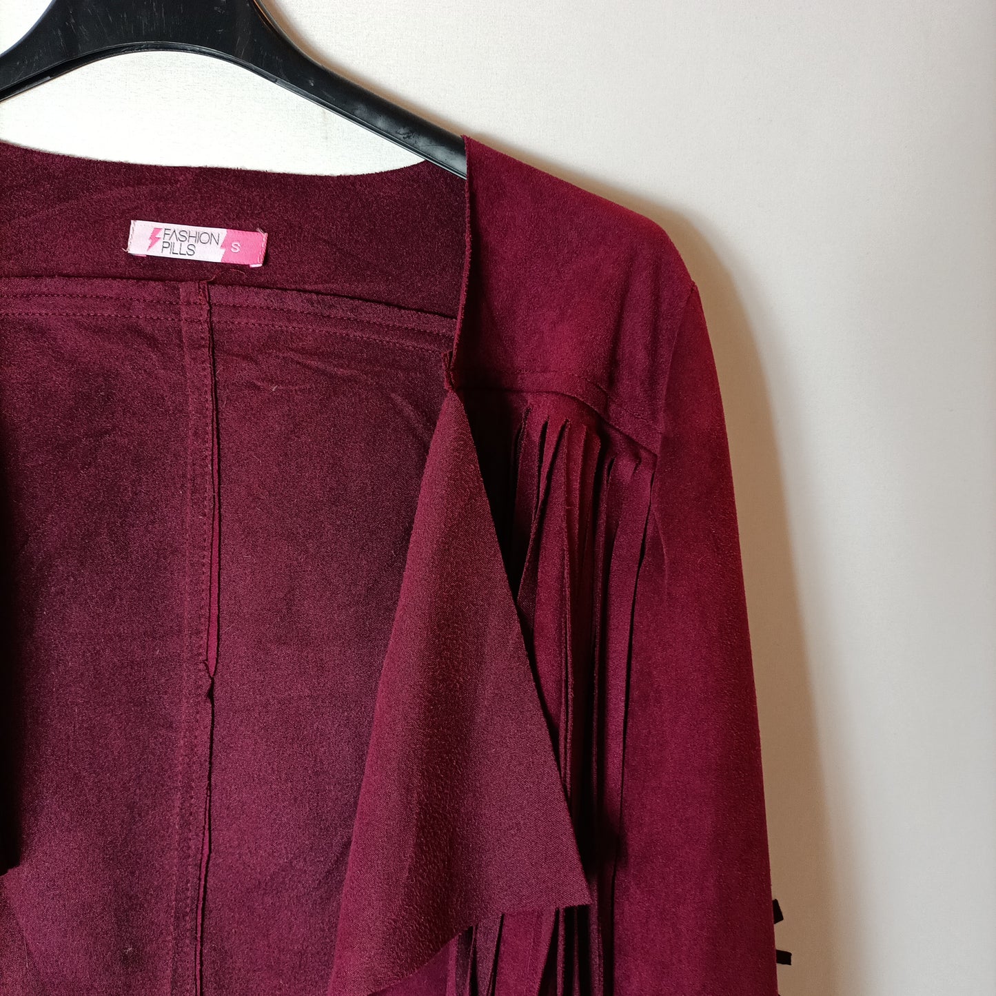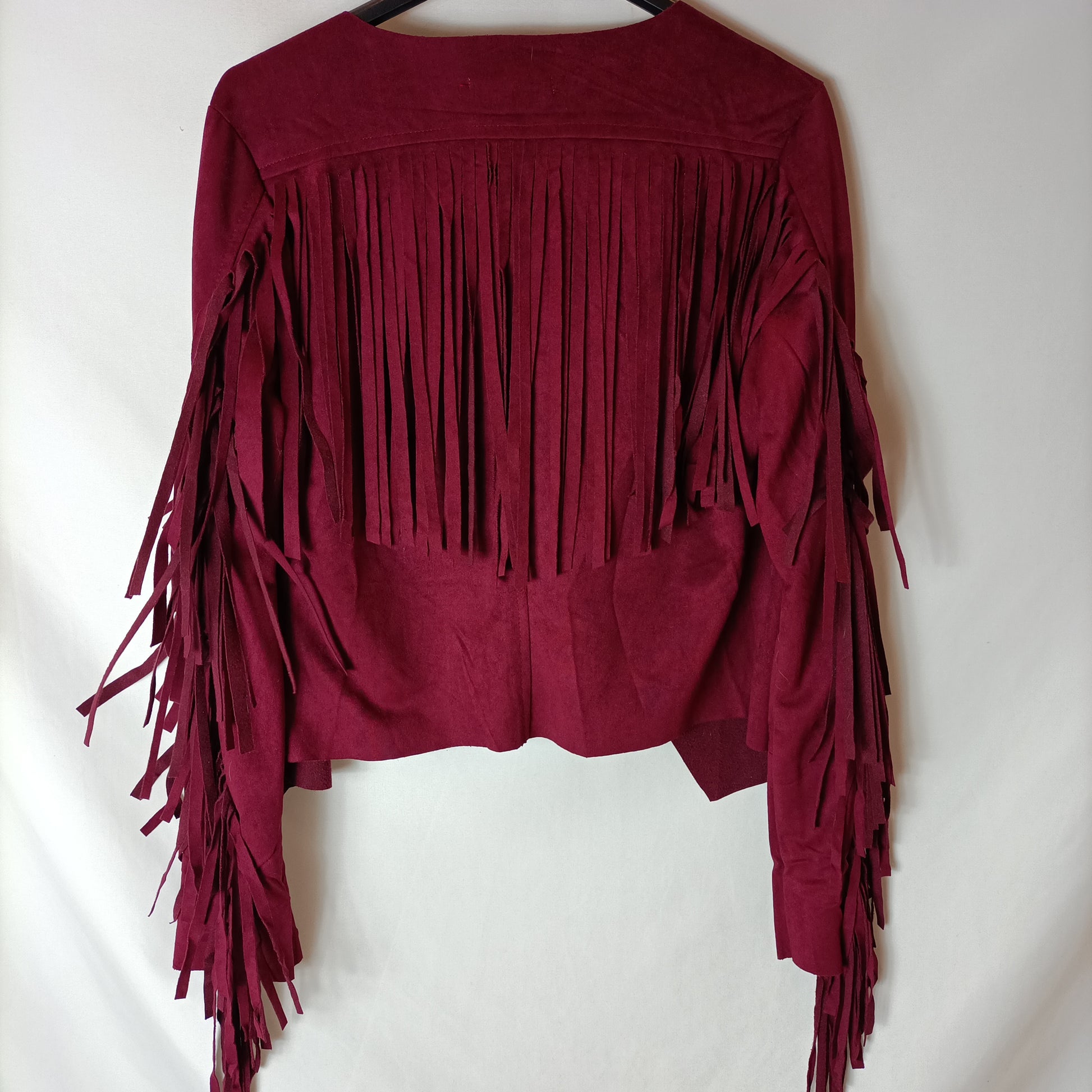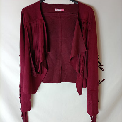 chaqueta fina burdeos de antelina con flecos.