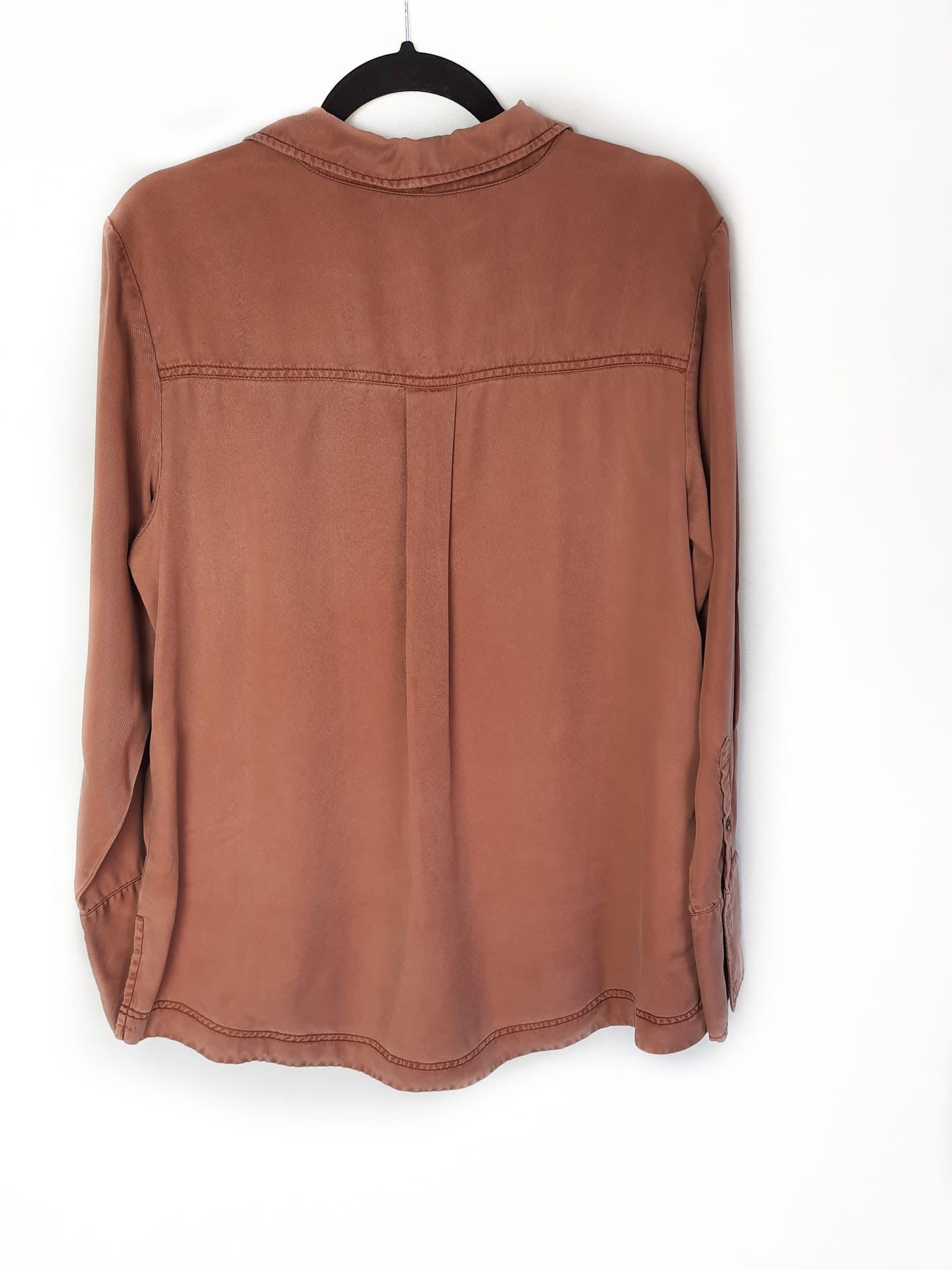 Blusa morada escotada con botones frontales nácar y en las mangas