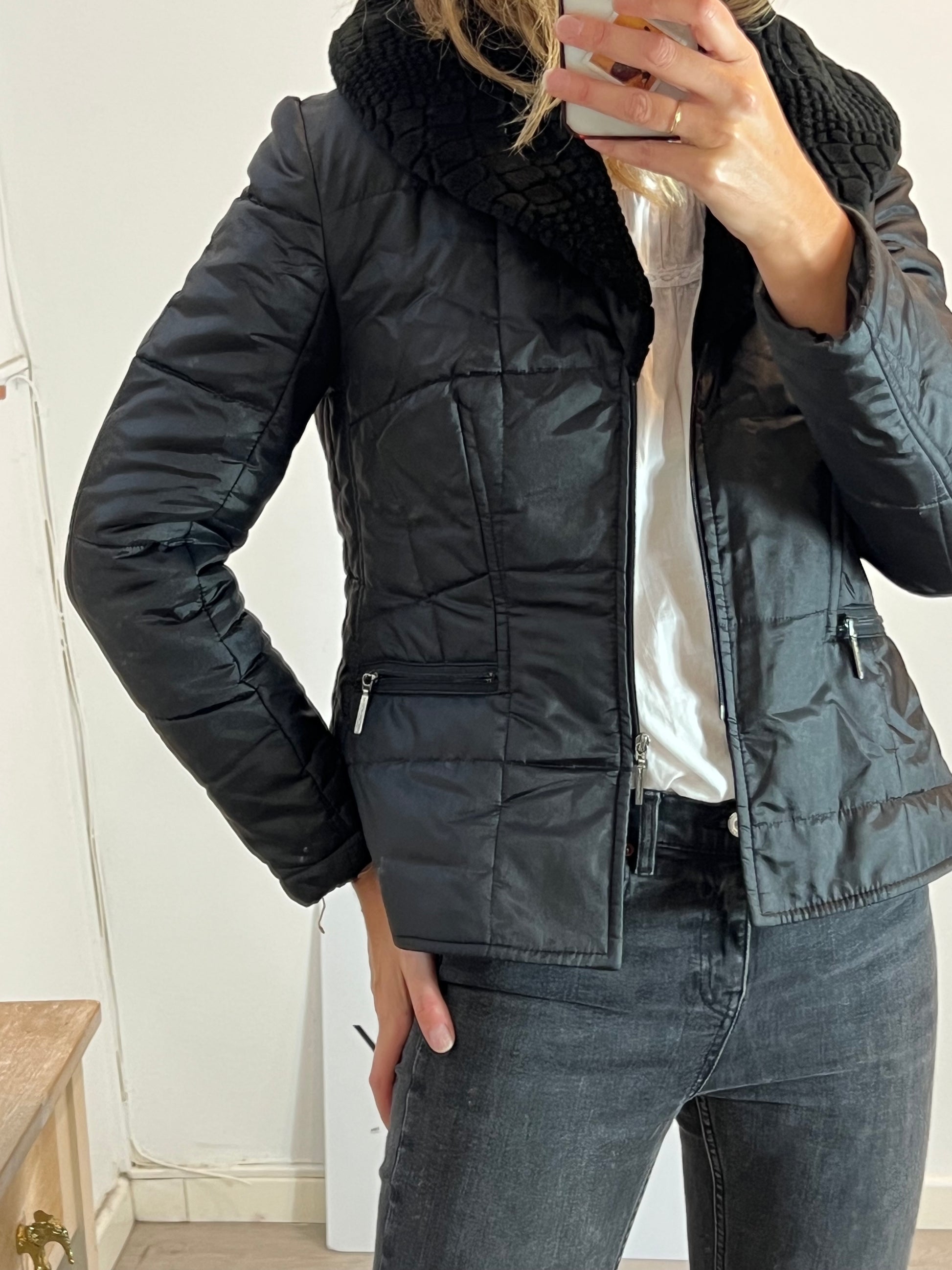 plumas negro fino con cuello de pelo . Hombros 41cm, de sisa a sisa 46cm, largo 60cm. Talla 44 en etiqueta