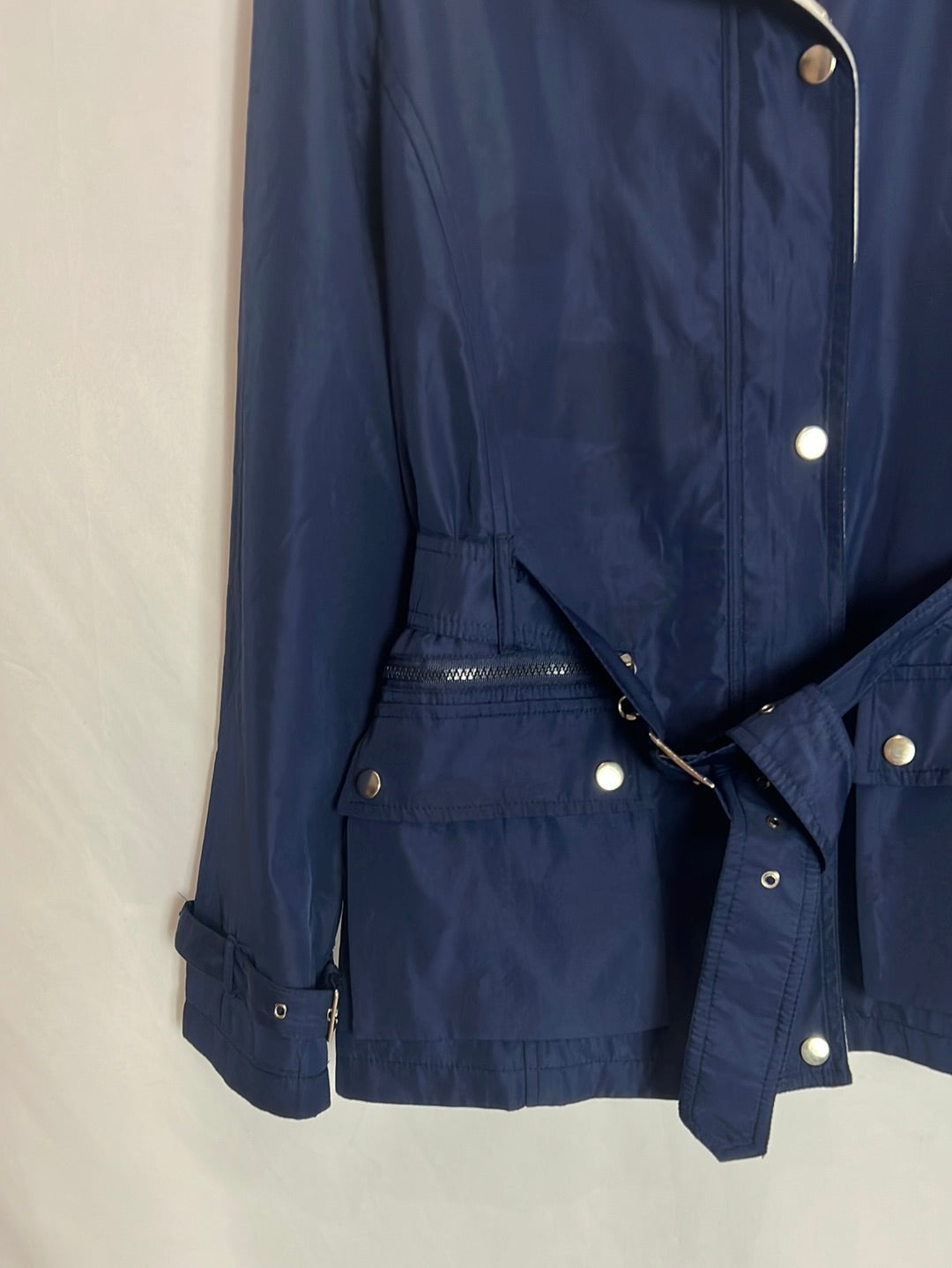 parka azul fina con capucha y cinturón.largo 68cm, hombros 44cm