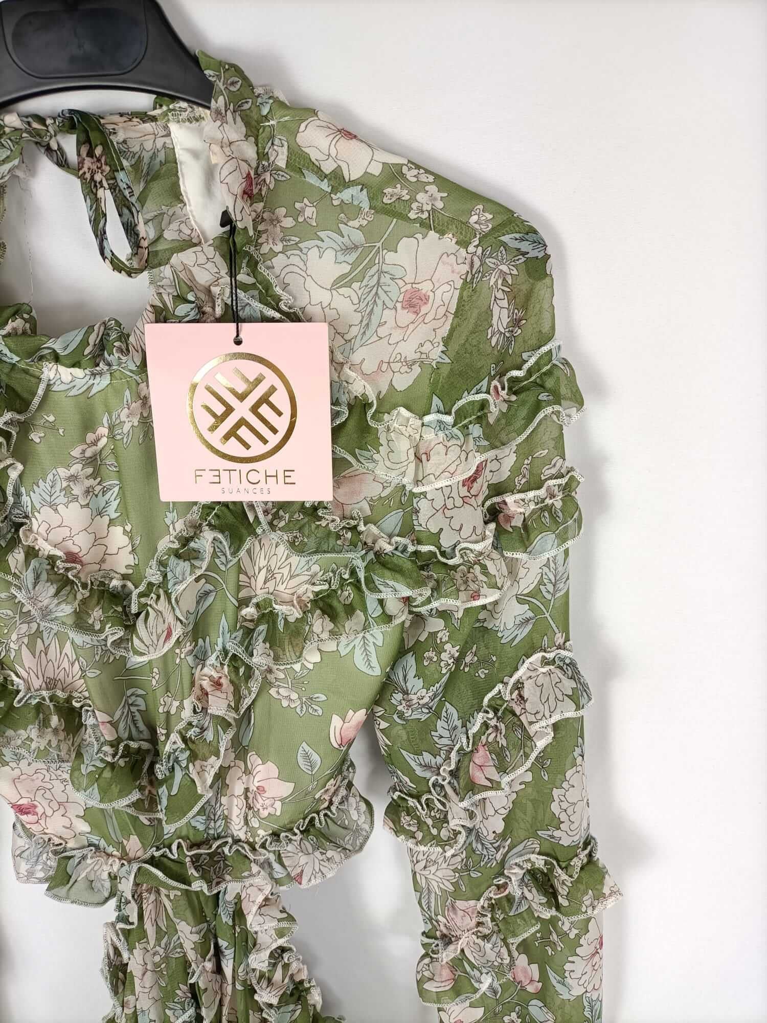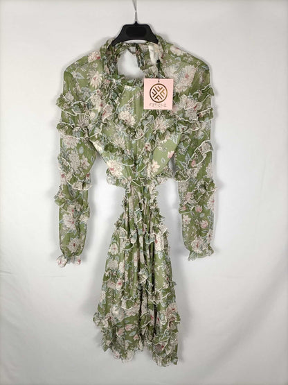 Fetiche Suances. NUEVO CON ETIQUETA. Vestido corto verde con flores en rosita palo y mini volantes. Espalda al aire. Largo 72 cm