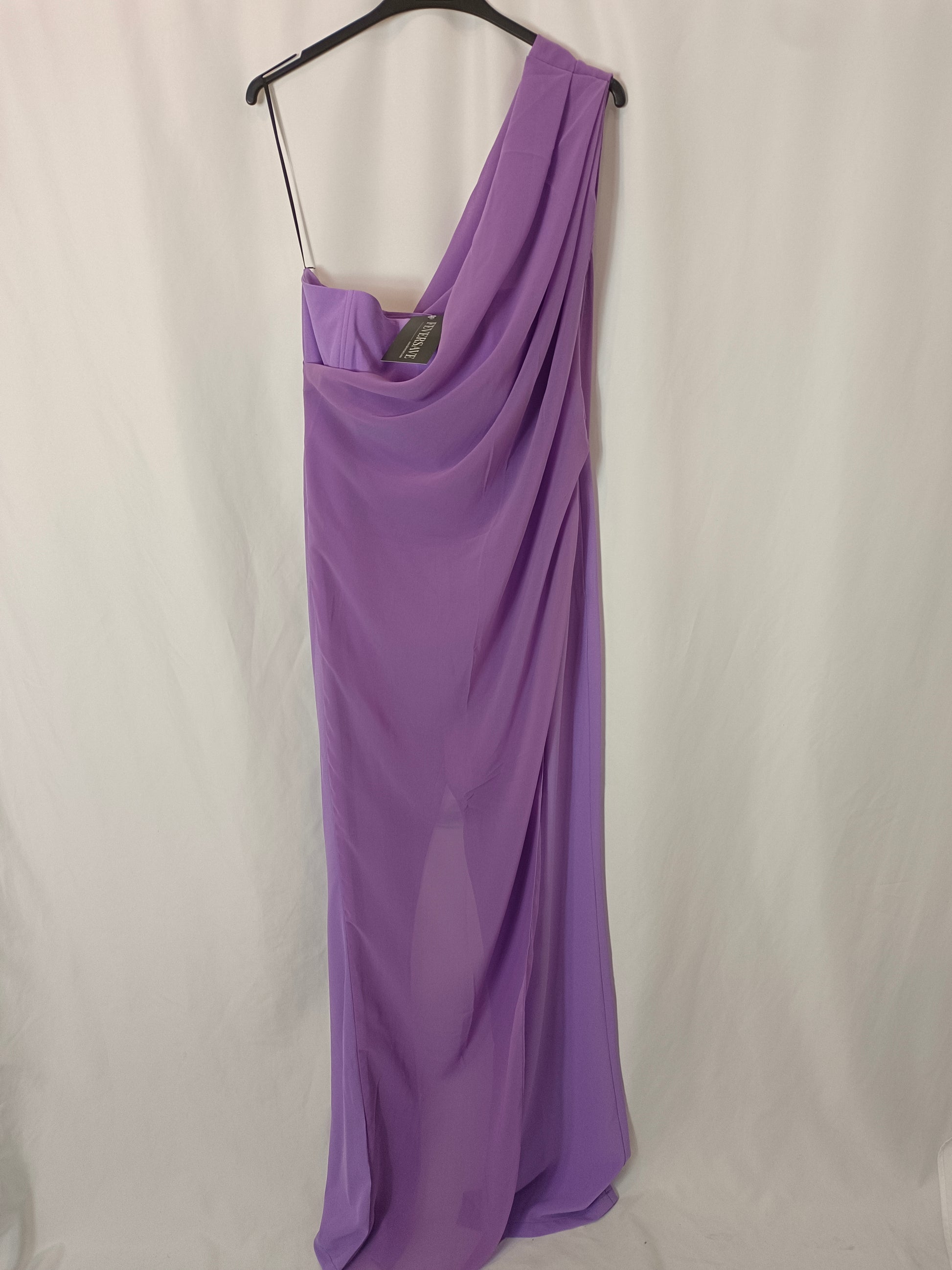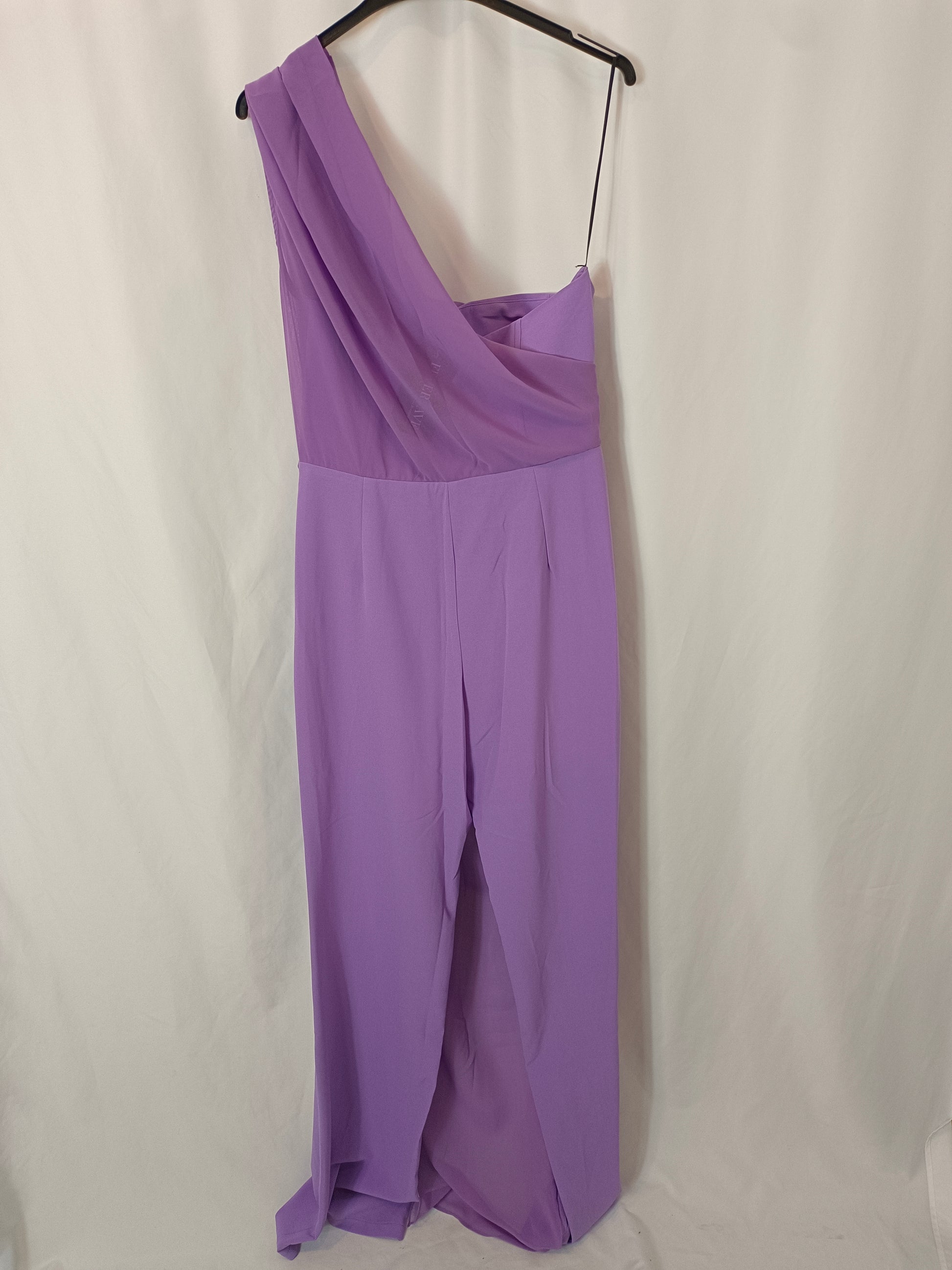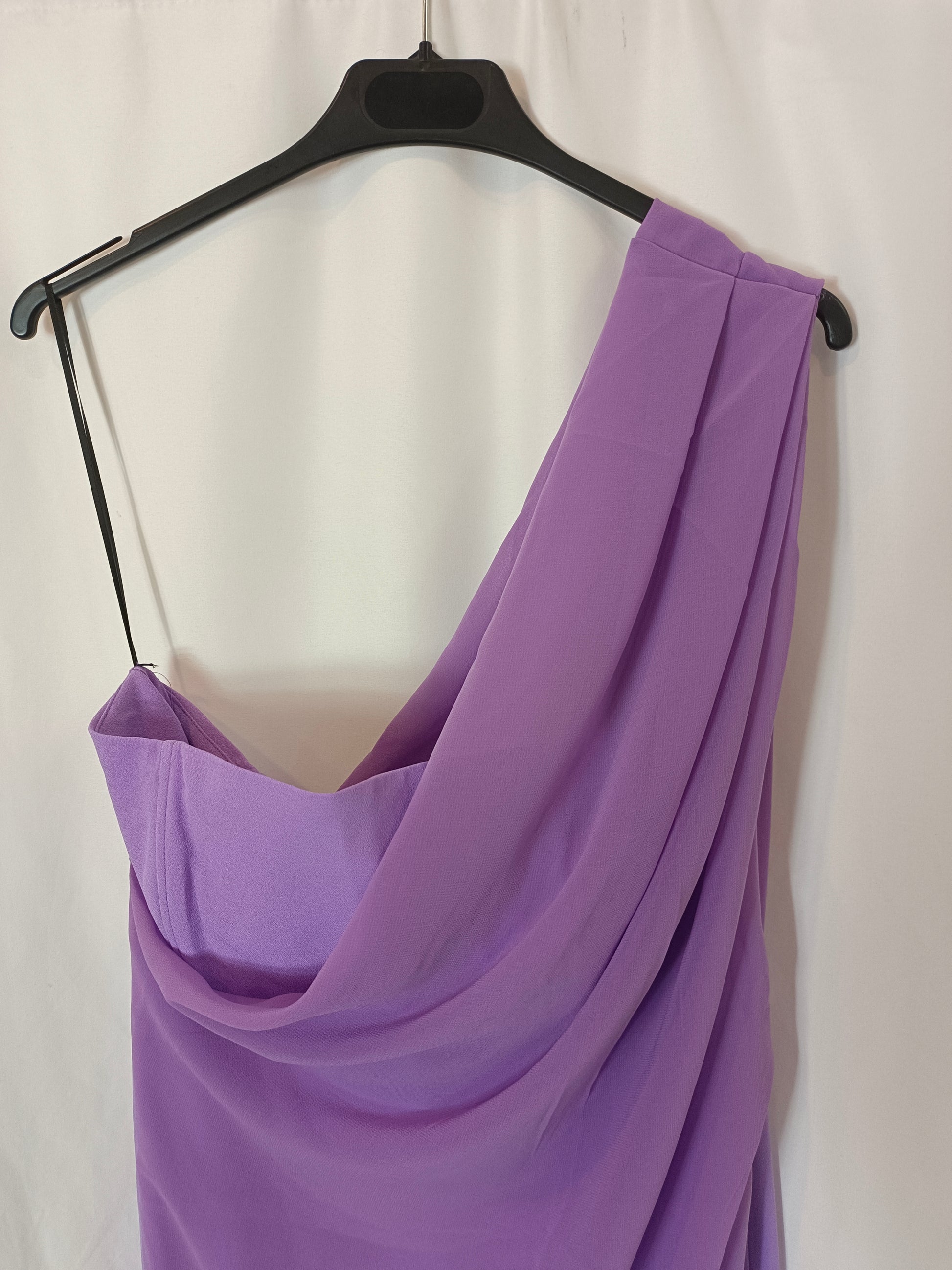 NUEVO CON ETIQUETA. Mono morados asimétrico con detalle de sobrecapa