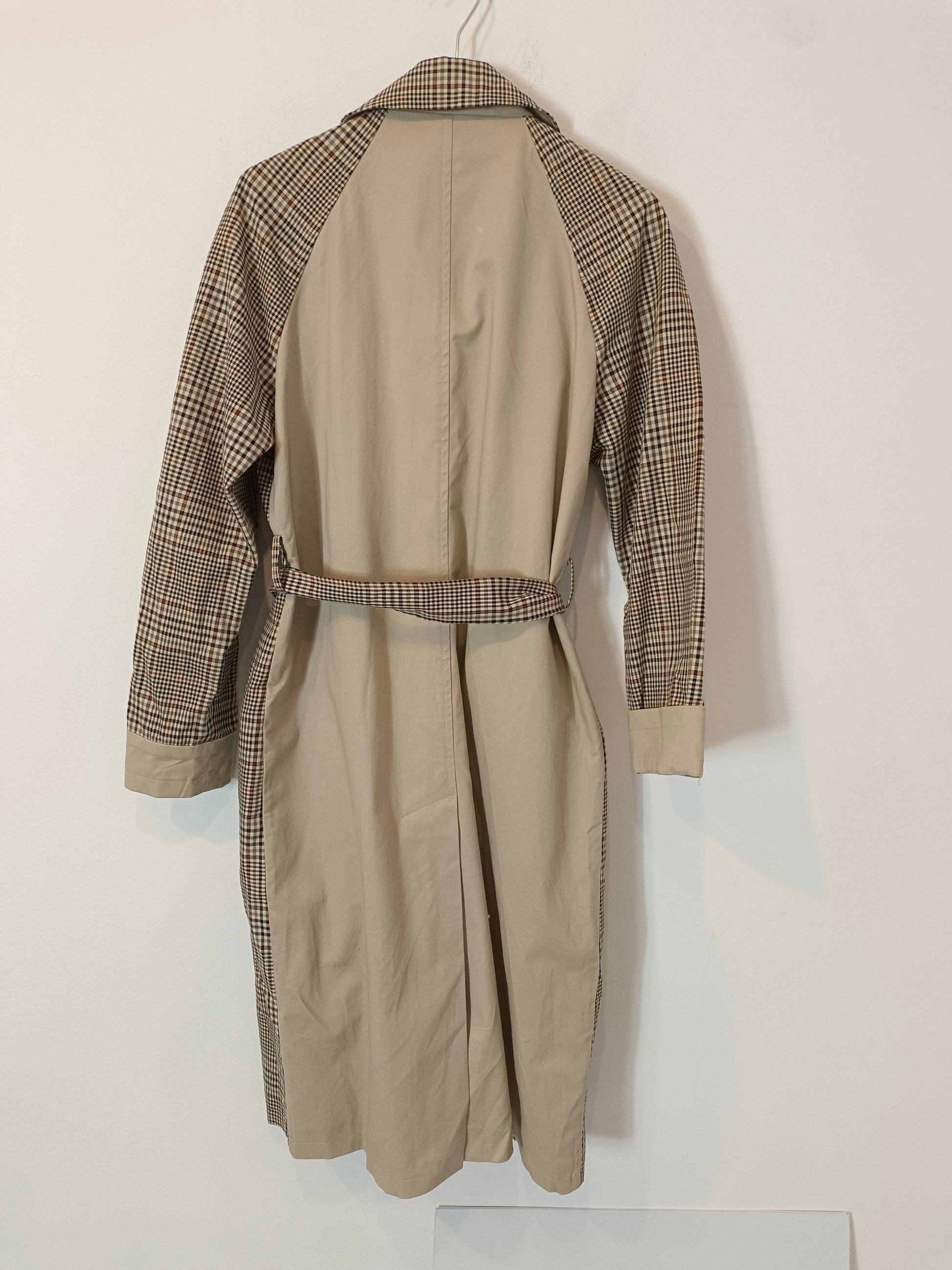 gabardina beige de cuadros estilo pata de gallo en tonos tierra. Espalda. lisa. Fina. De sisa a sisa 46 cm largo 110 cm