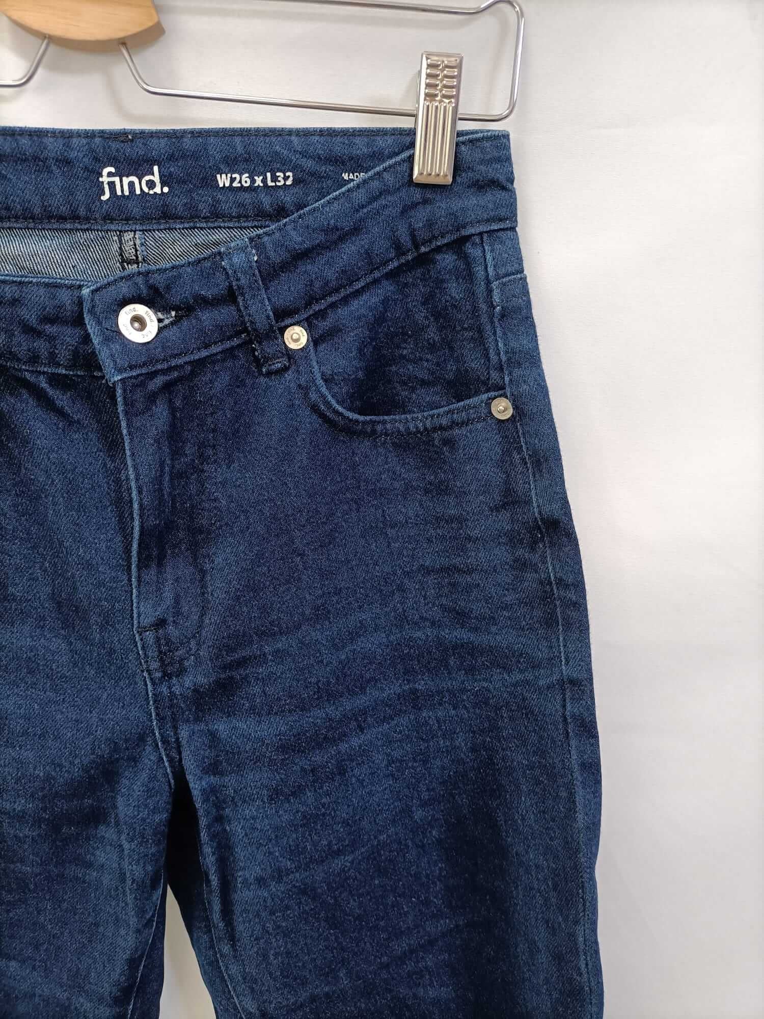 Find. 26 (34). Pantalón denim oscuro recto y alto de cintura. No elástico. Cintura 34 cm largo 97 cm