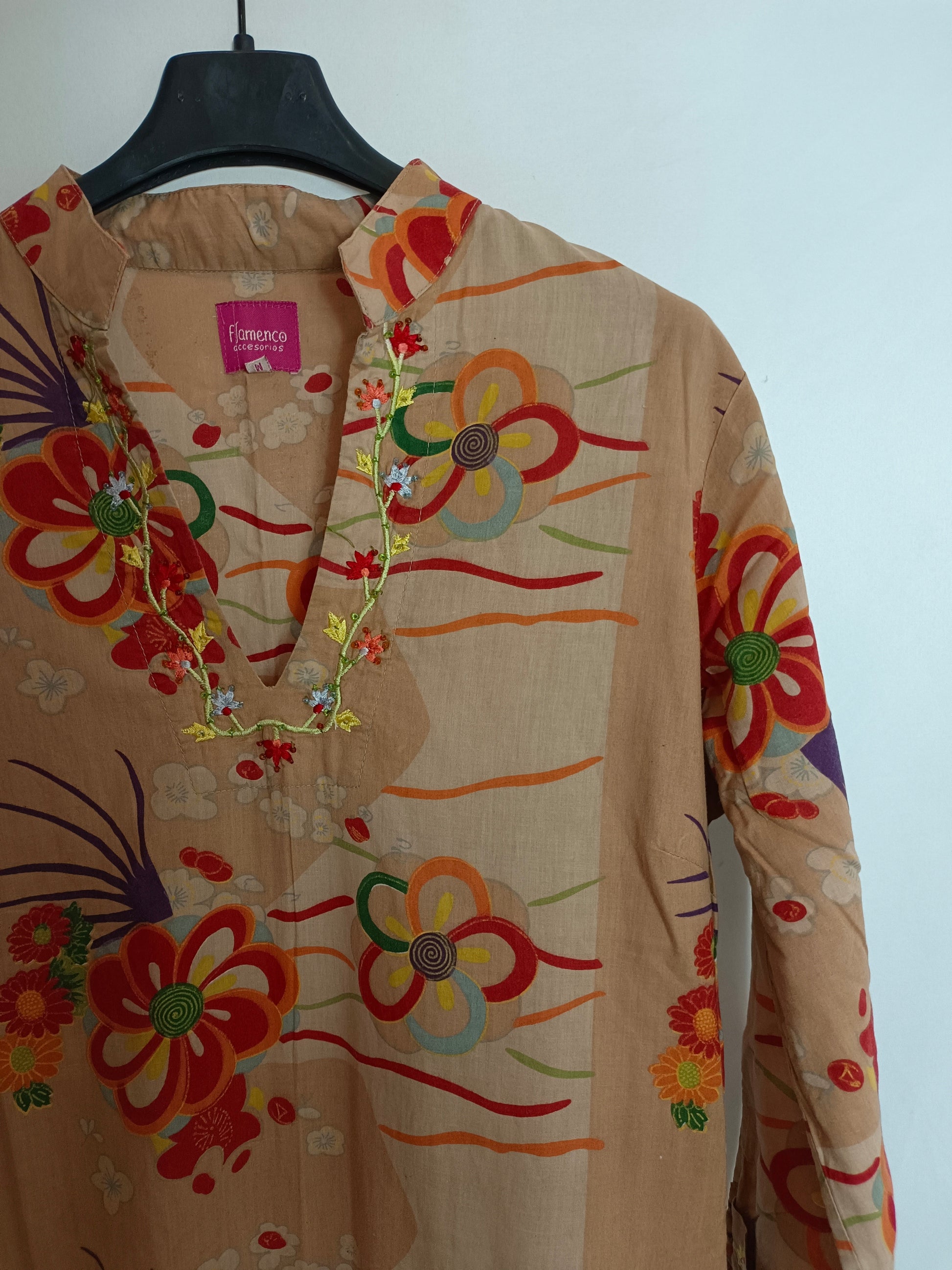 vestido largo beige con flores. estilo camisero con detalle bordados en el cuello.