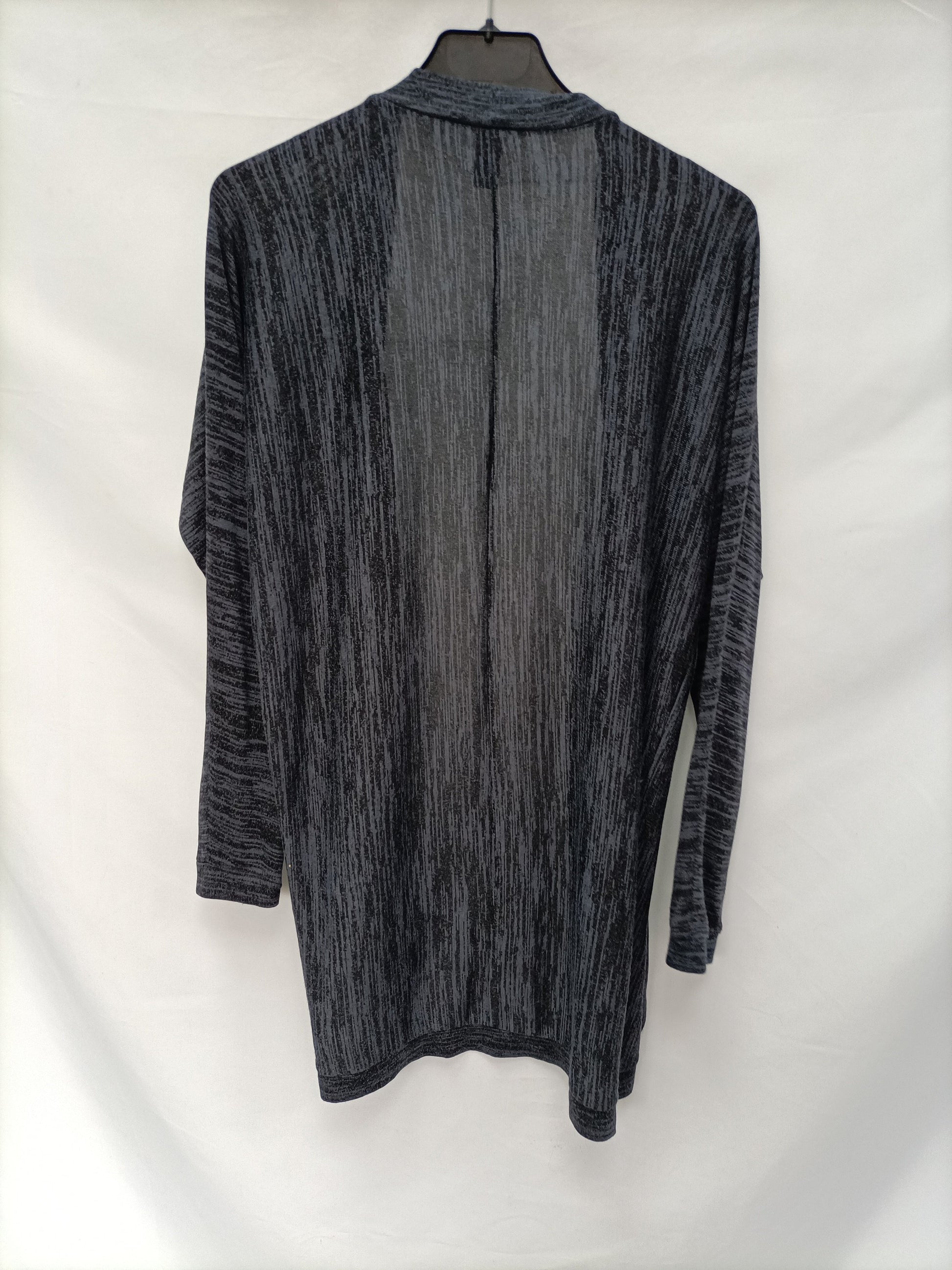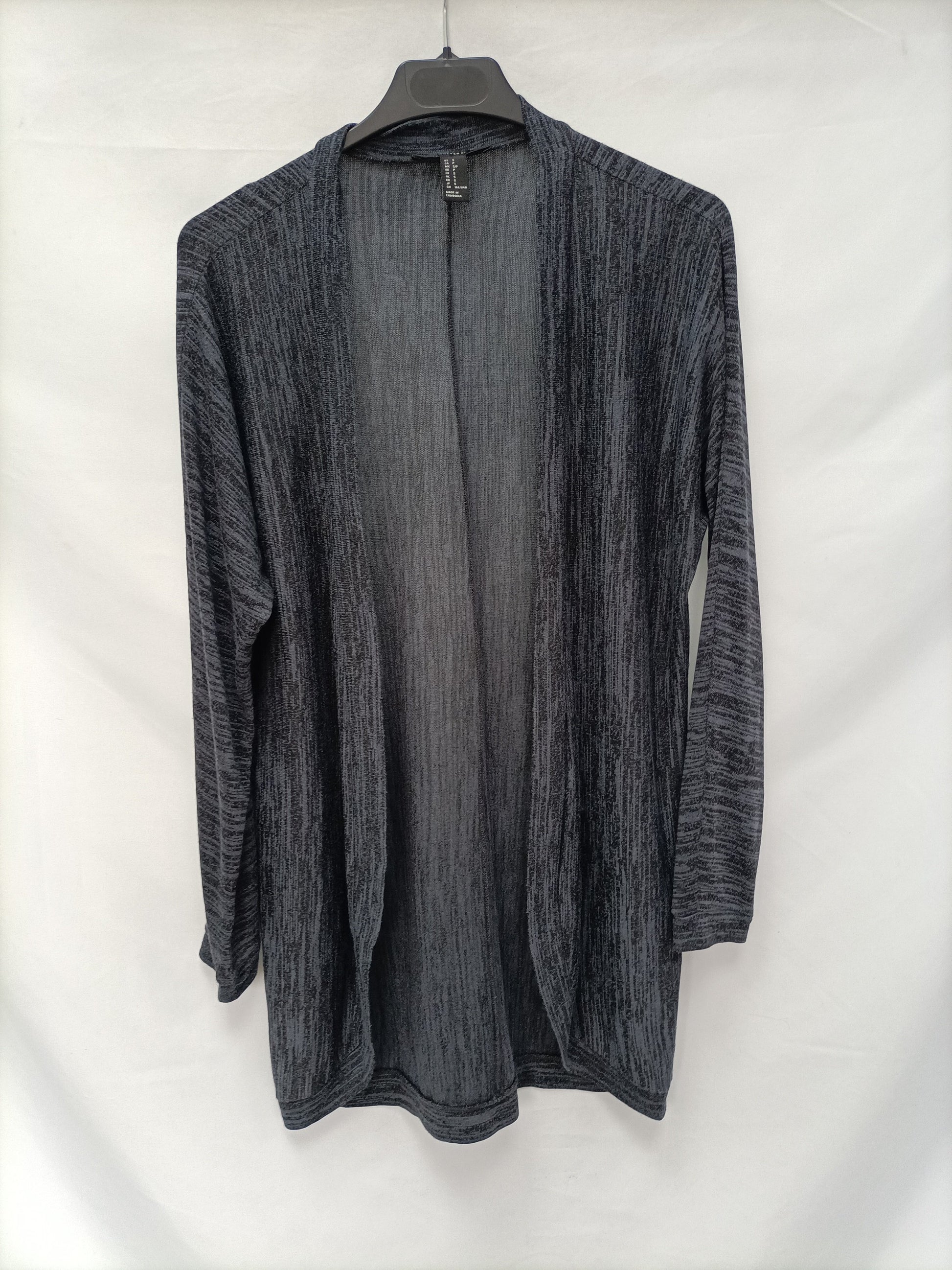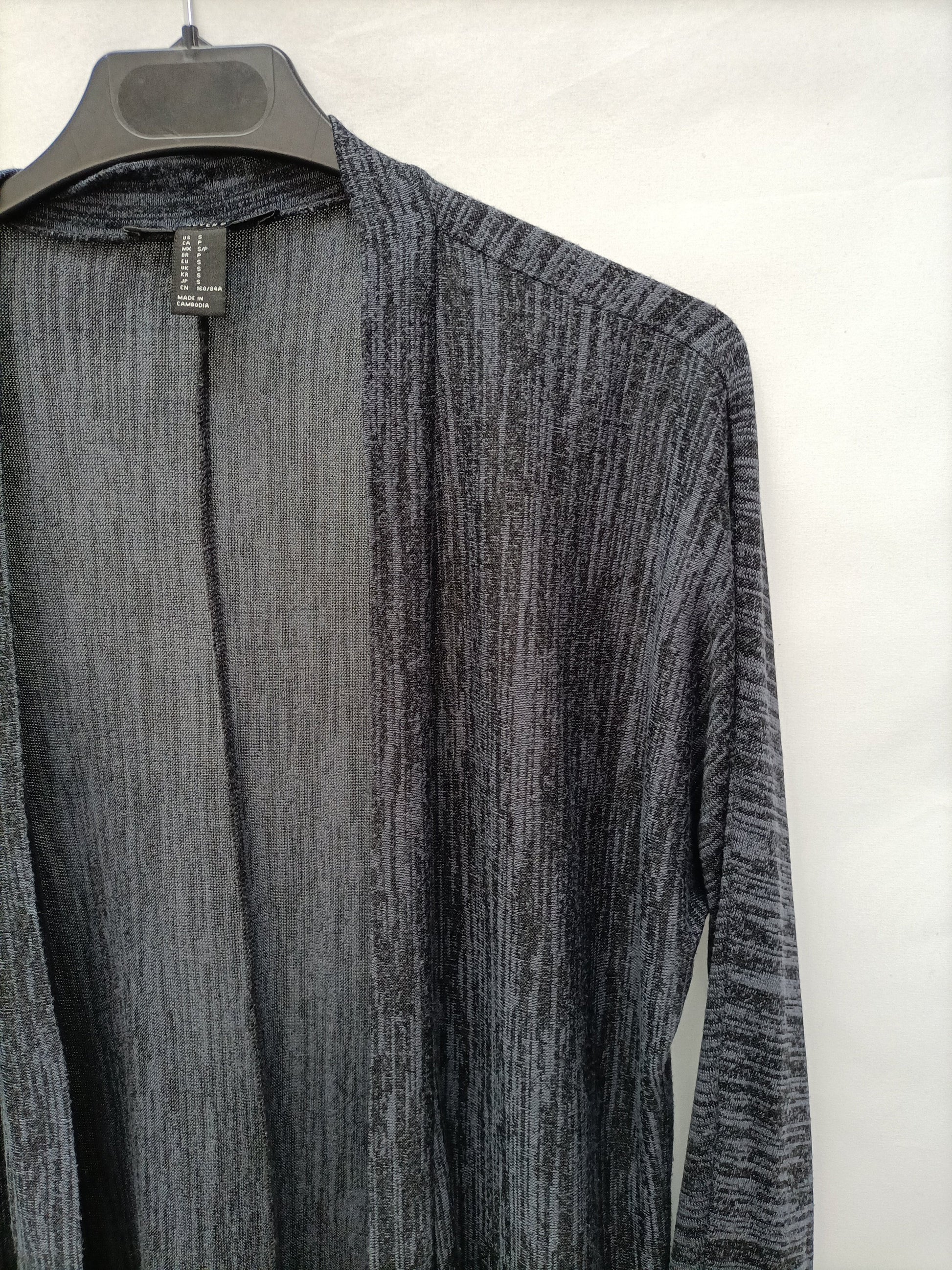 Cárdigan finito jaspeado azul y negro. No se abrocha y es elástico. Largo 83 cm.