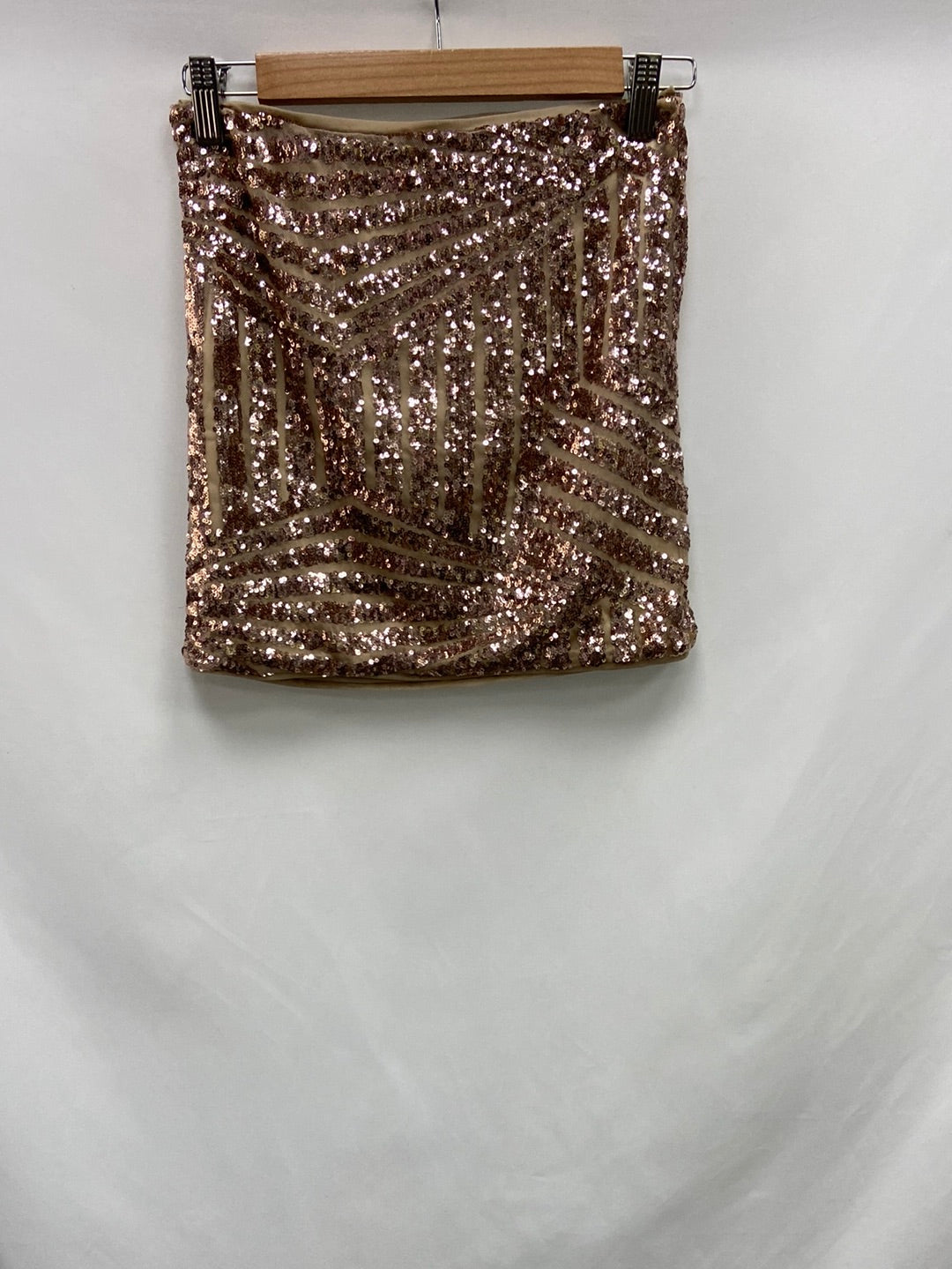 Falda corta elástica de lentejuelas color oro rosado. Largo 36 cm.