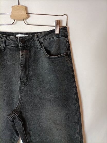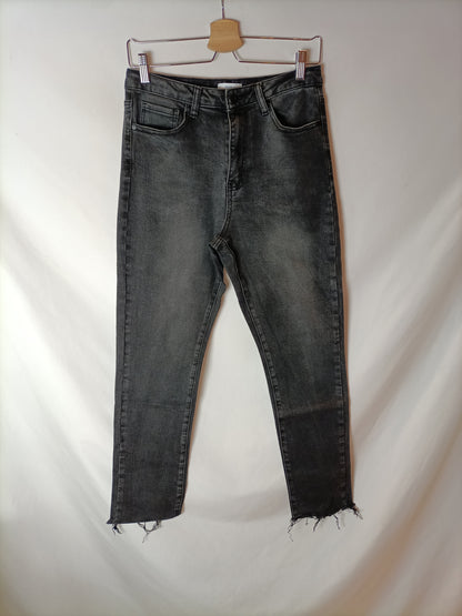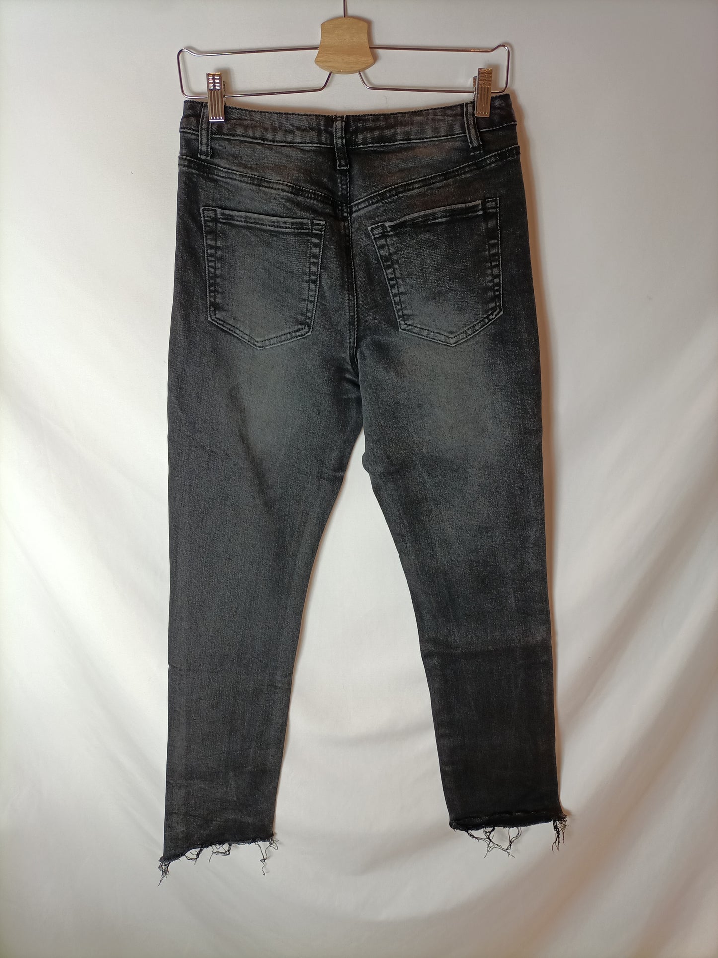 Pantalón negro de tejido denim semielástico. Bajo desflecado. Cintura 36 cm