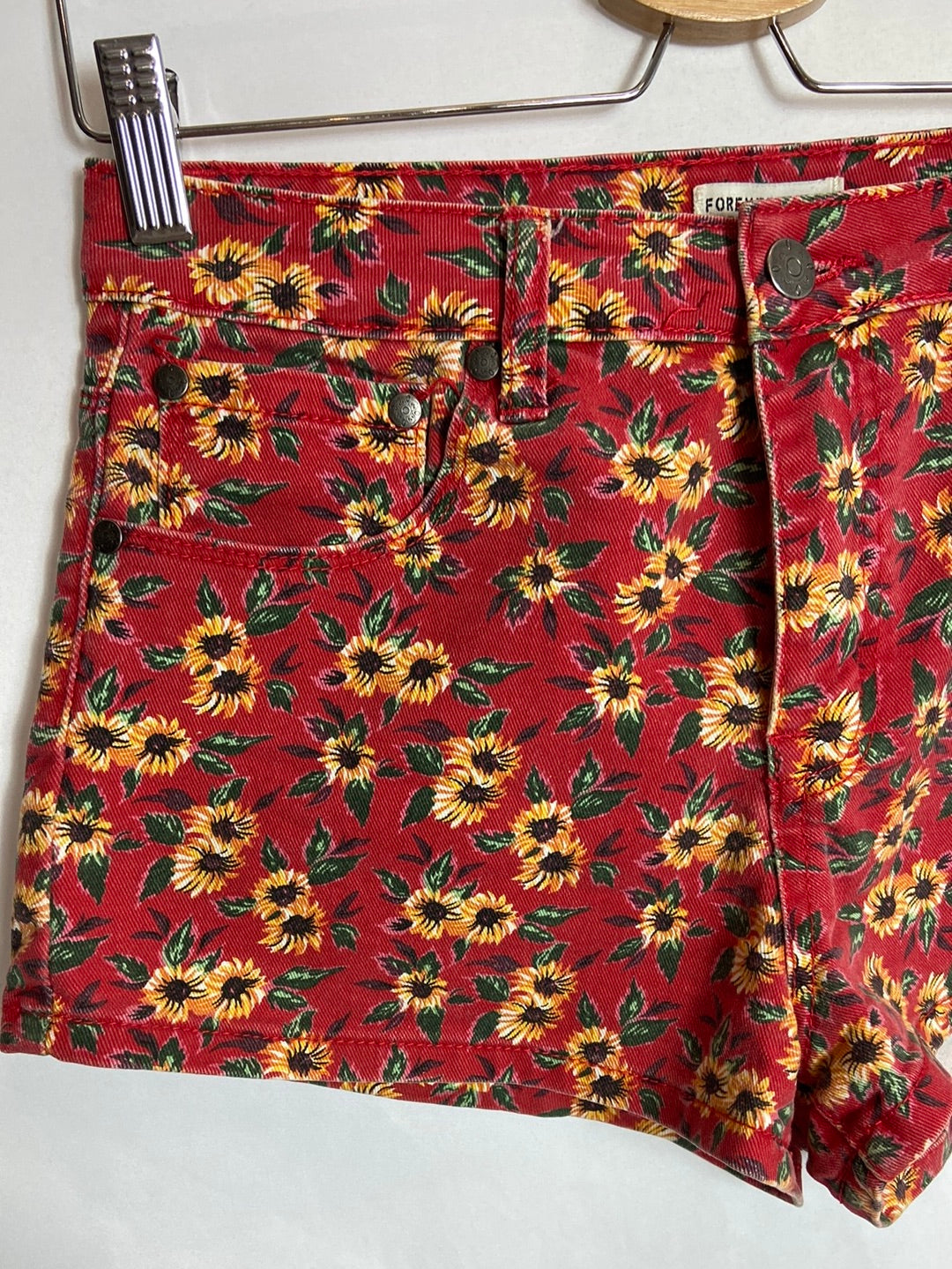 Pantalón corto rojo denim con estampado de girasoles. cintura 36 cm .