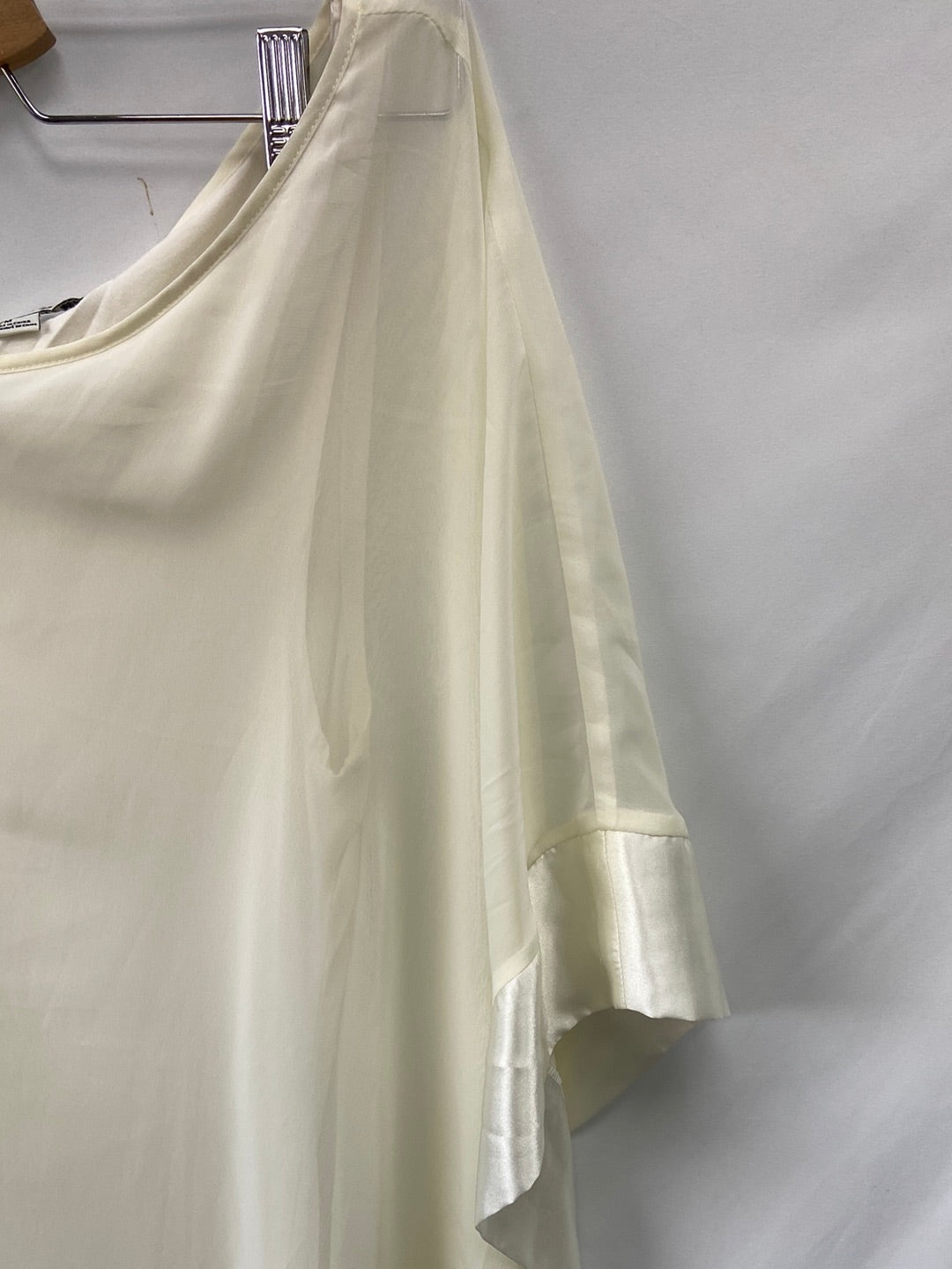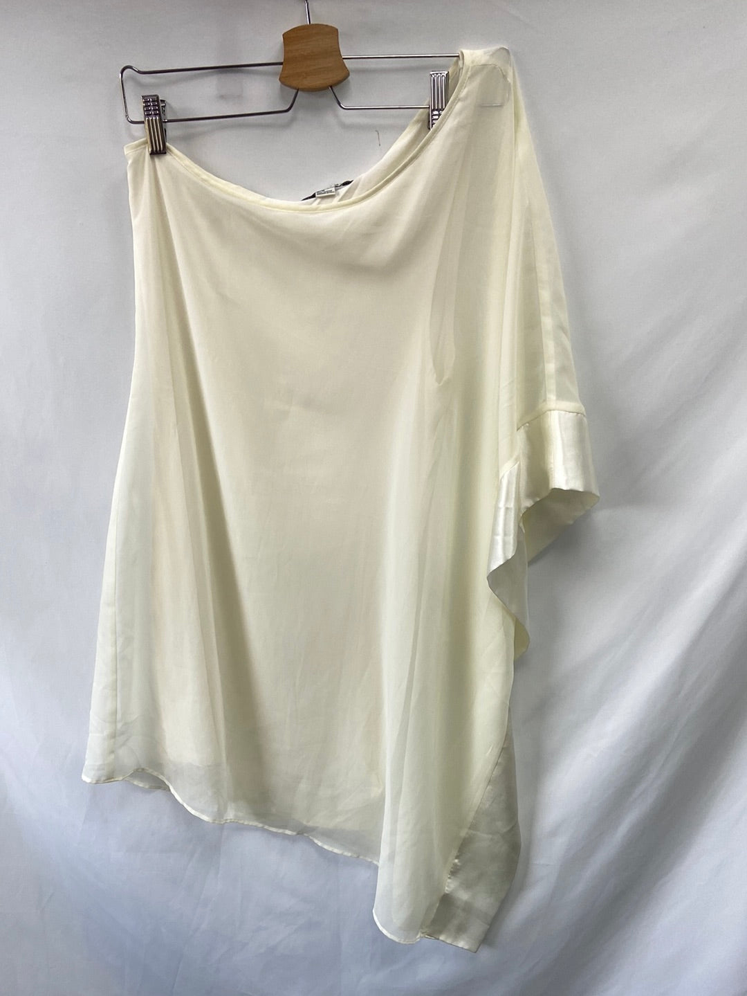 Vestido asimétrico blanco roto con textura seda en la manga. Forro interior elástico. Largo 86 cm